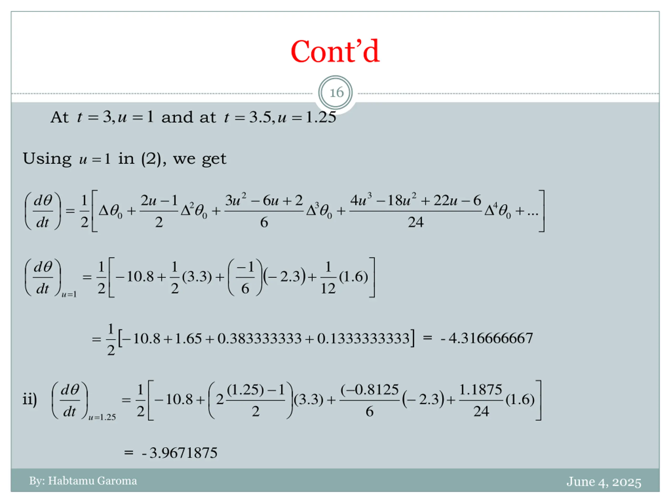 Contd 16 = = = = , 3 1 t u At and at , 5 . 3 . 1 25 t u = Using in (2), we get 1 u dt + + 2 3 2 1 2 1 3 6 2 4 18 22 6 d u u u u u u = + + 3 + + 2 4 ... 0 0 0 0 2 2 6 24 d 1 1 1 1 ( ) = + + + 10 8 . ) 3 . 3 ( 2 3 . 2 ) 6 . 1 ( 12 2 6 dt = 1 u 1 = = . 1 + 383333333 . 0 + 1333333333 . 0 + - 4.31666666 7 10 8 . 65 2 d ) 3 . 3 ( 1 . 1 ( 2 25 ) 1 ( 8125 . 0 1875 . 1 ( ) ii) = + + + 10 8 . 3 . 2 ) 6 . 1 ( 2 2 6 24 dt = . 1 25 u = 3.9671875 - June 4, 2025 By: Habtamu Garoma
