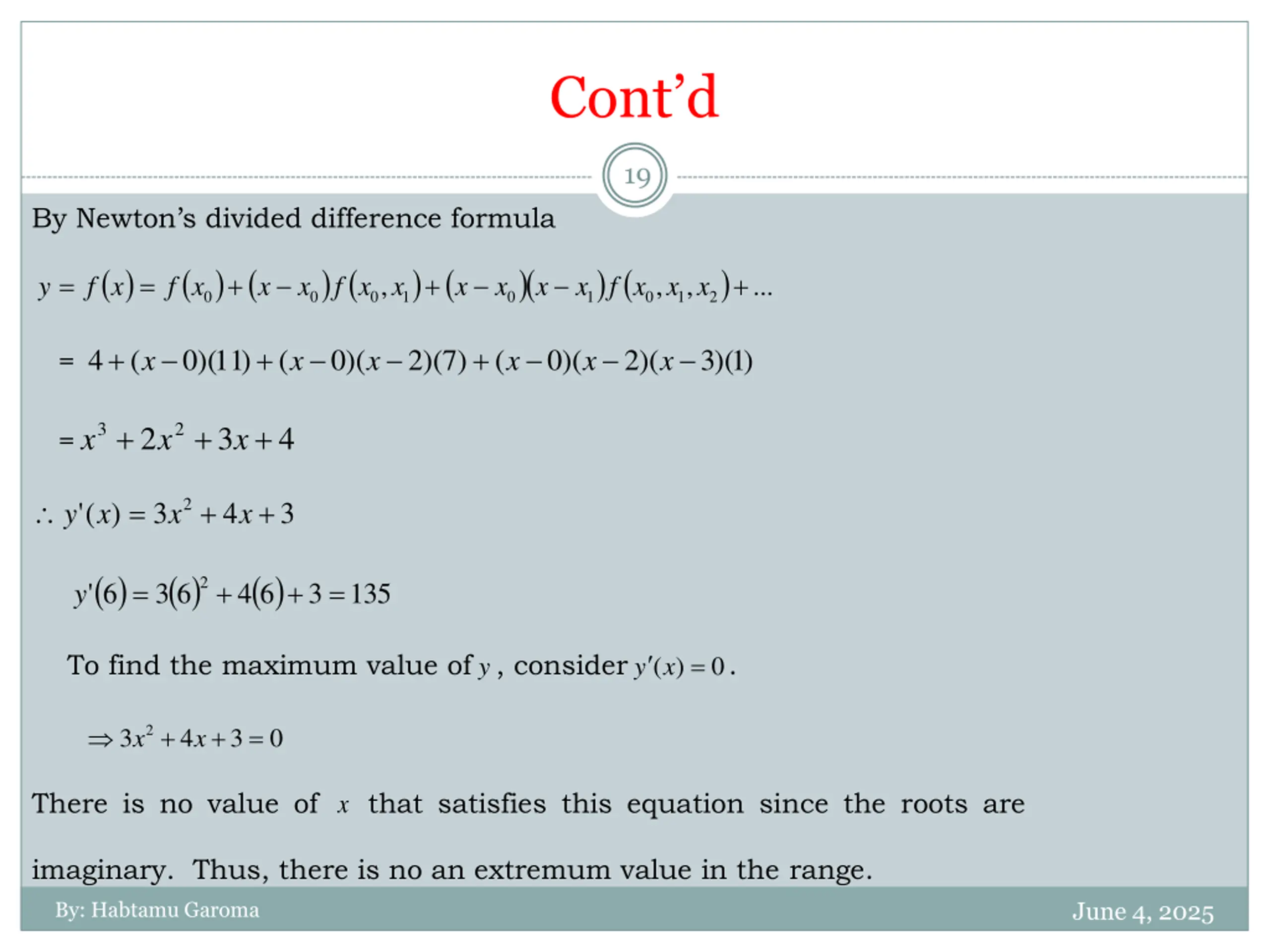 Contd 19 By Newton s divided difference formula ( ) x ( ) ( 0 x ) ( f ) ( + )( ) ( f ) ... + = = + , , , y f f x x x x x x x x x x x 0 0 1 0 1 0 1 2 + + + 4 ( 0 )( 11 ) ( 0 )( ) 7 )( 2 ( 0 )( 2 )( ) 1 )( 3 x x x x x x = + + + 3 2 2 3 4 x x x = = + + 2 ( ' y ) 3 4 3 x x x ( ) y ( ) 6 3 ( ) 6 4 2 = + + = ' 6 3 135 x To find the maximum value of y , consider . = ( ) 0 y + + = 2 3 4 3 0 x x There is no value of x that satisfies this equation since the roots are imaginary. Thus, there is no an extremum value in the range. June 4, 2025 By: Habtamu Garoma