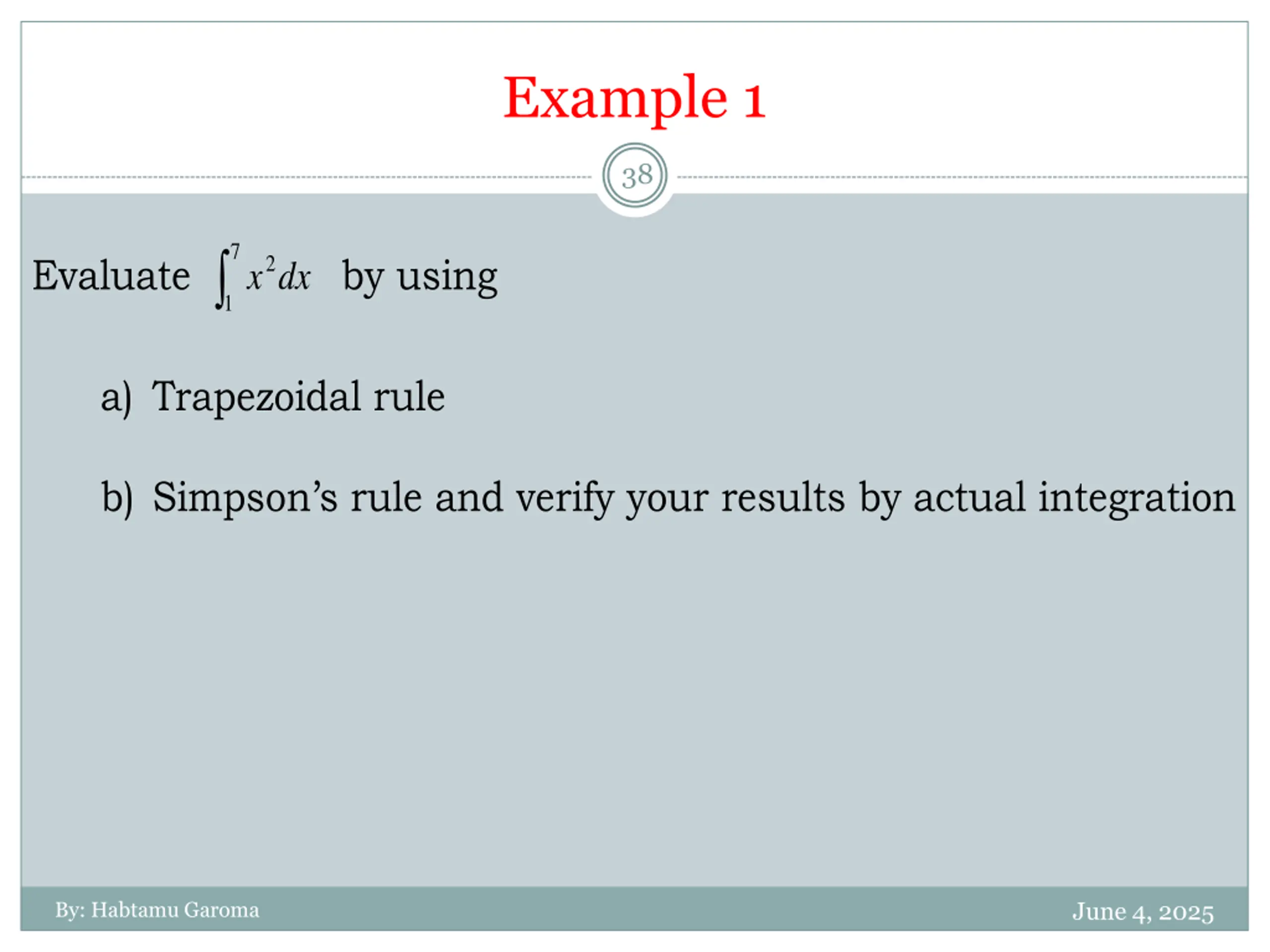 Example 1 38 7 x 1 Evaluate by using 2 dx a)Trapezoidal rule b)Simpson s rule and verify your results by actual integration June 4, 2025 By: Habtamu Garoma
