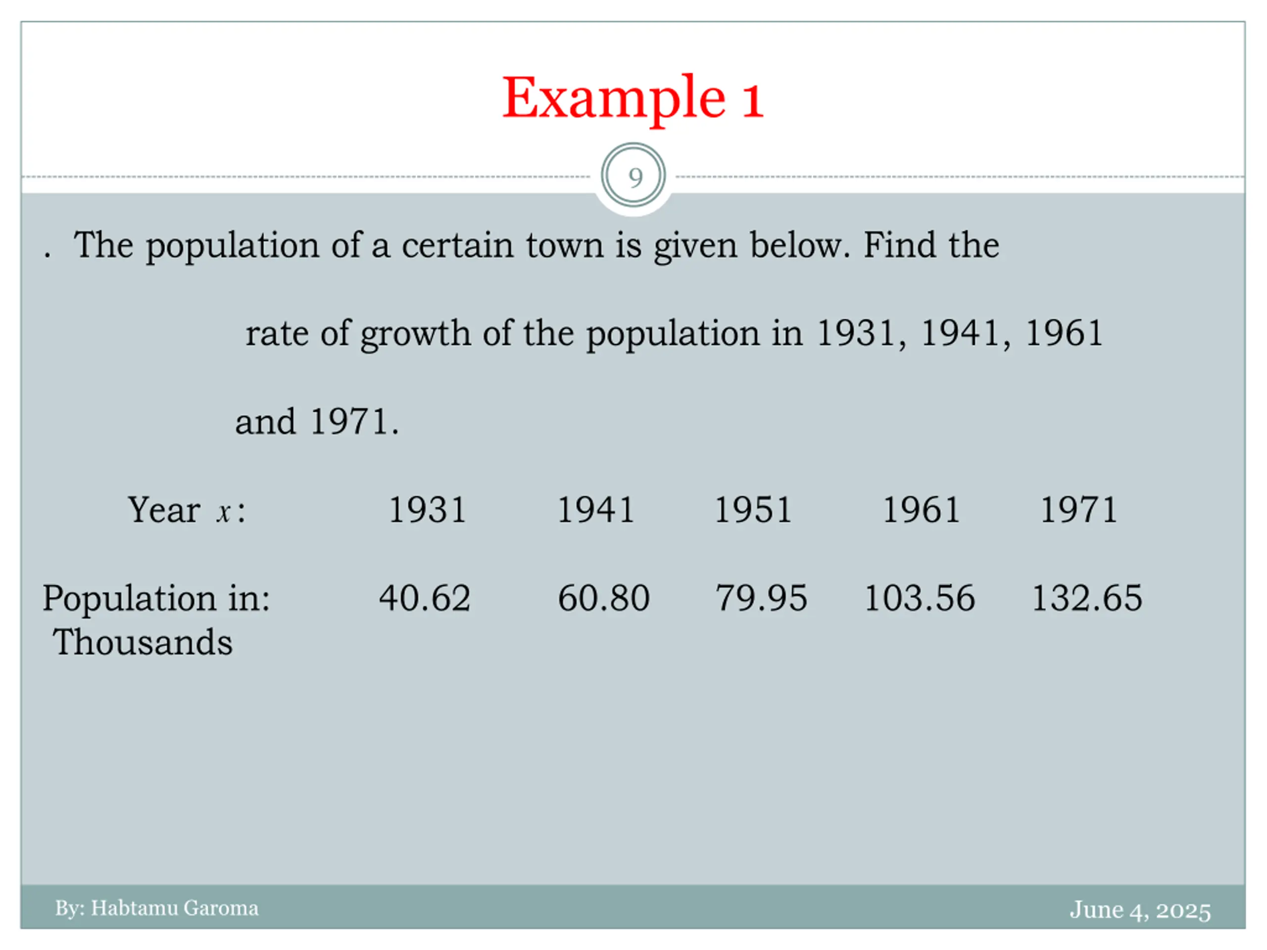 Example 1 9 . The population of a certain town is given below. Find the rate of growth of the population in 1931, 1941, 1961 and 1971. Year x: 1931 1941 1951 1961 1971 Population in: 40.62 60.80 79.95 103.56 132.65 Thousands June 4, 2025 By: Habtamu Garoma