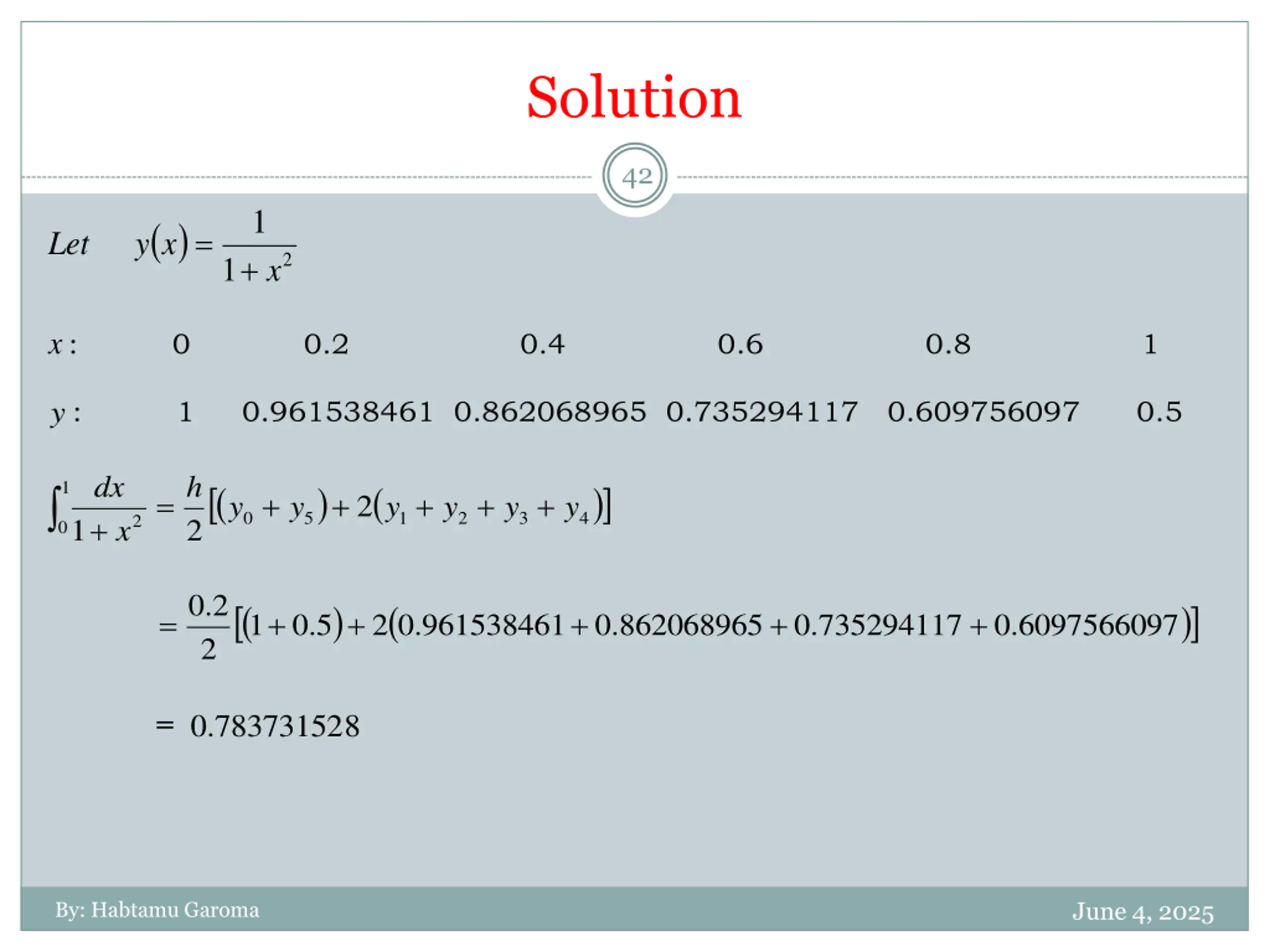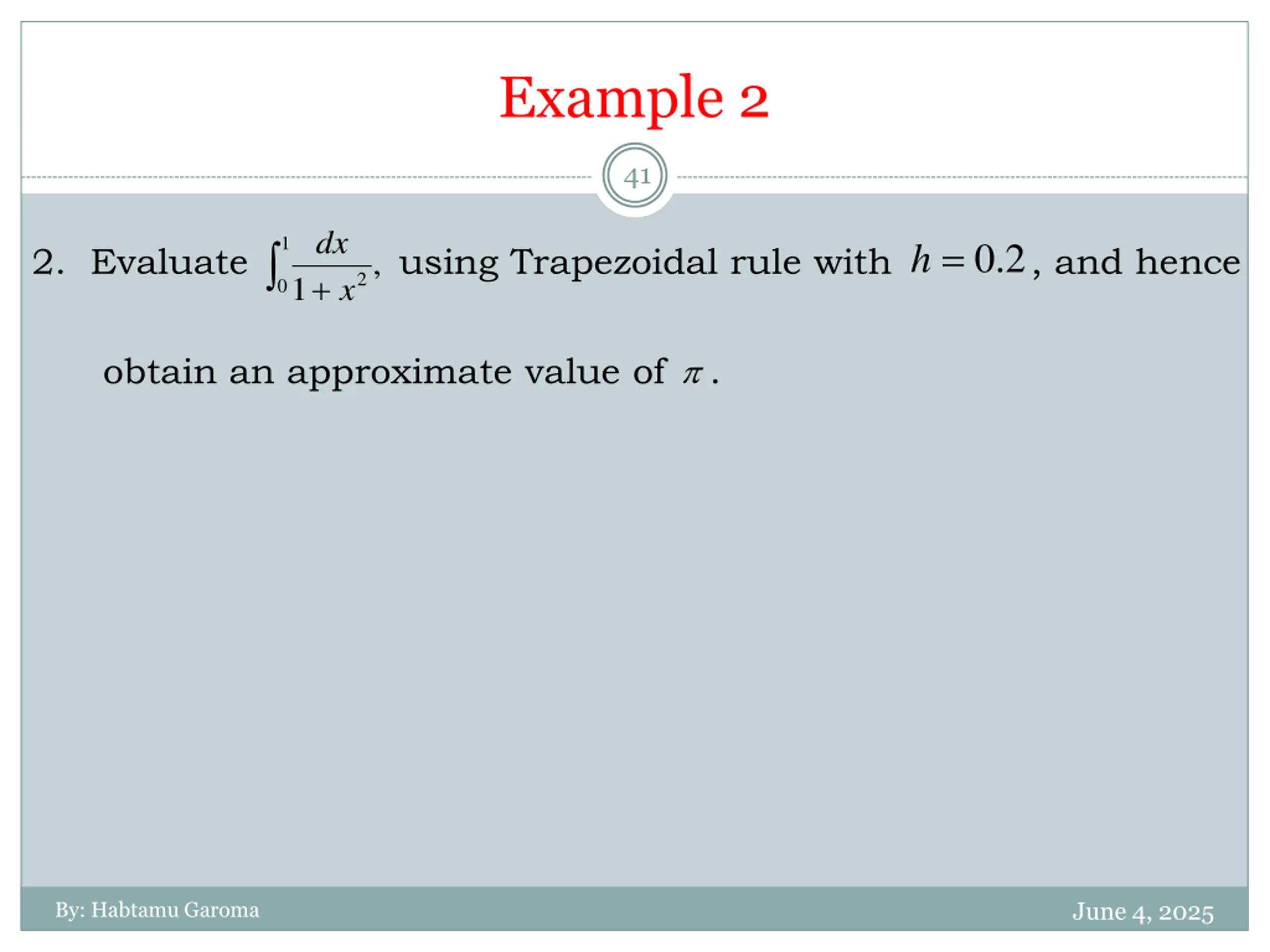 Example 2 41 dx = 1 2 . 0 h 2. Evaluate using Trapezoidal rule with , and hence , + x 2 1 0 obtain an approximate value of . June 4, 2025 By: Habtamu Garoma