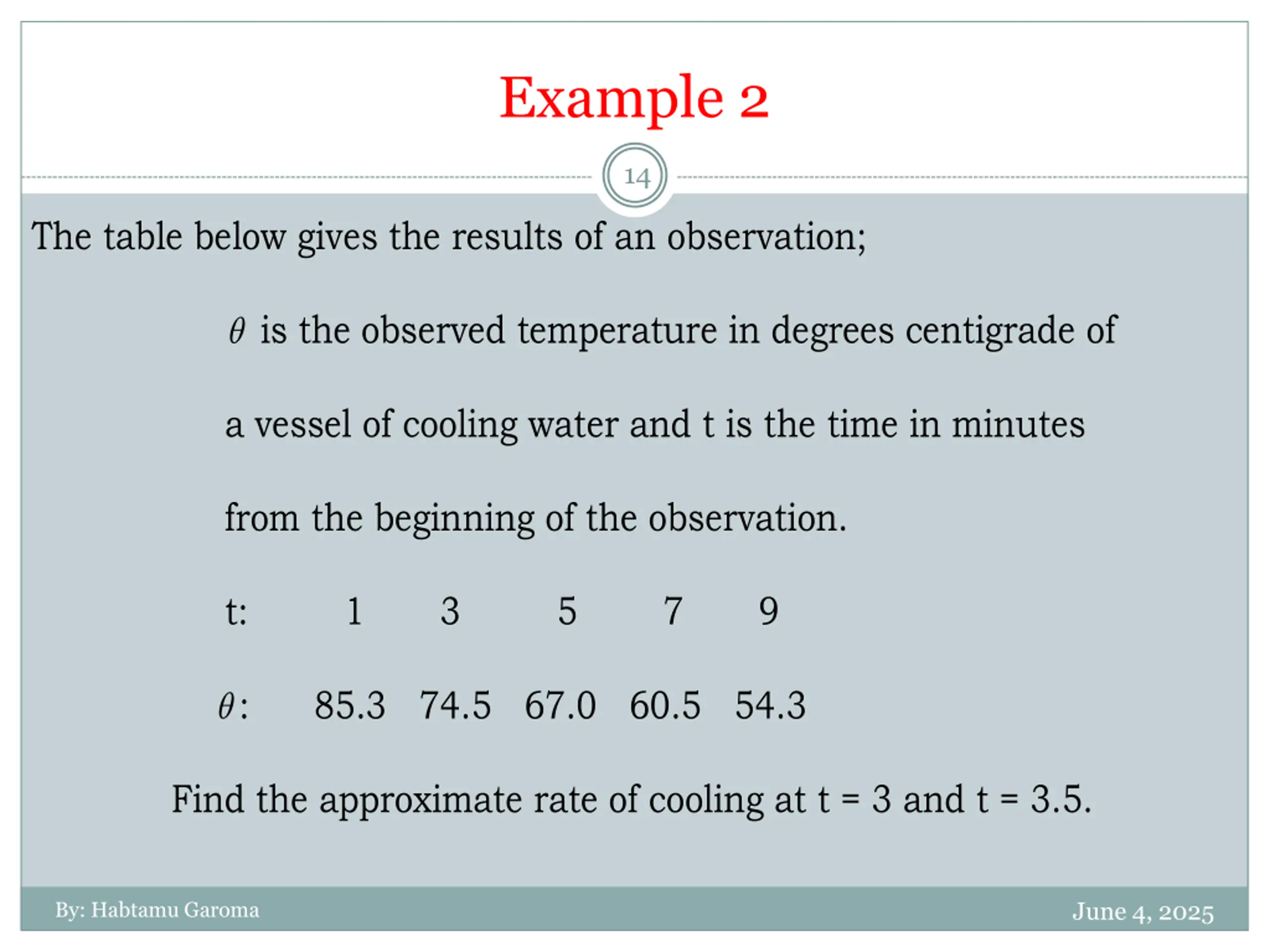 Example 2 14 The table below gives the results of an observation; is the observed temperature in degrees centigrade of a vessel of cooling water and t is the time in minutes from the beginning of the observation. t: 1 3 5 7 9 : 85.3 74.5 67.0 60.5 54.3 Find the approximate rate of cooling at t = 3 and t = 3.5. June 4, 2025 By: Habtamu Garoma
