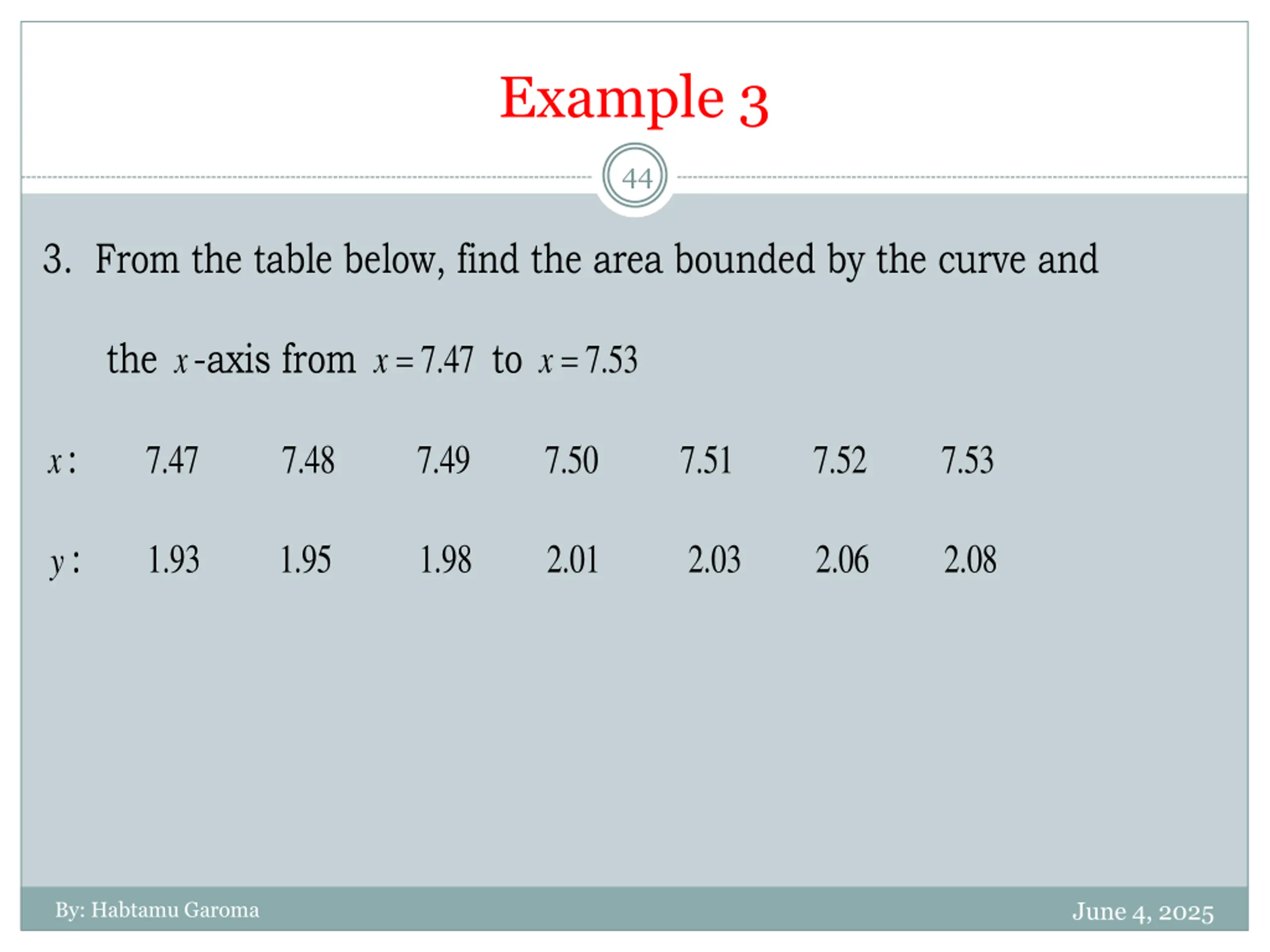 Example 3 44 3. From the table below, find the area bounded by the curve and = = the x-axis from to . 7 47 . 7 53 x x x: 7.47 7.48 7.49 7.50 7.51 7.52 7.53 y: 1.93 1.95 1.98 2.01 2.03 2.06 2.08 June 4, 2025 By: Habtamu Garoma