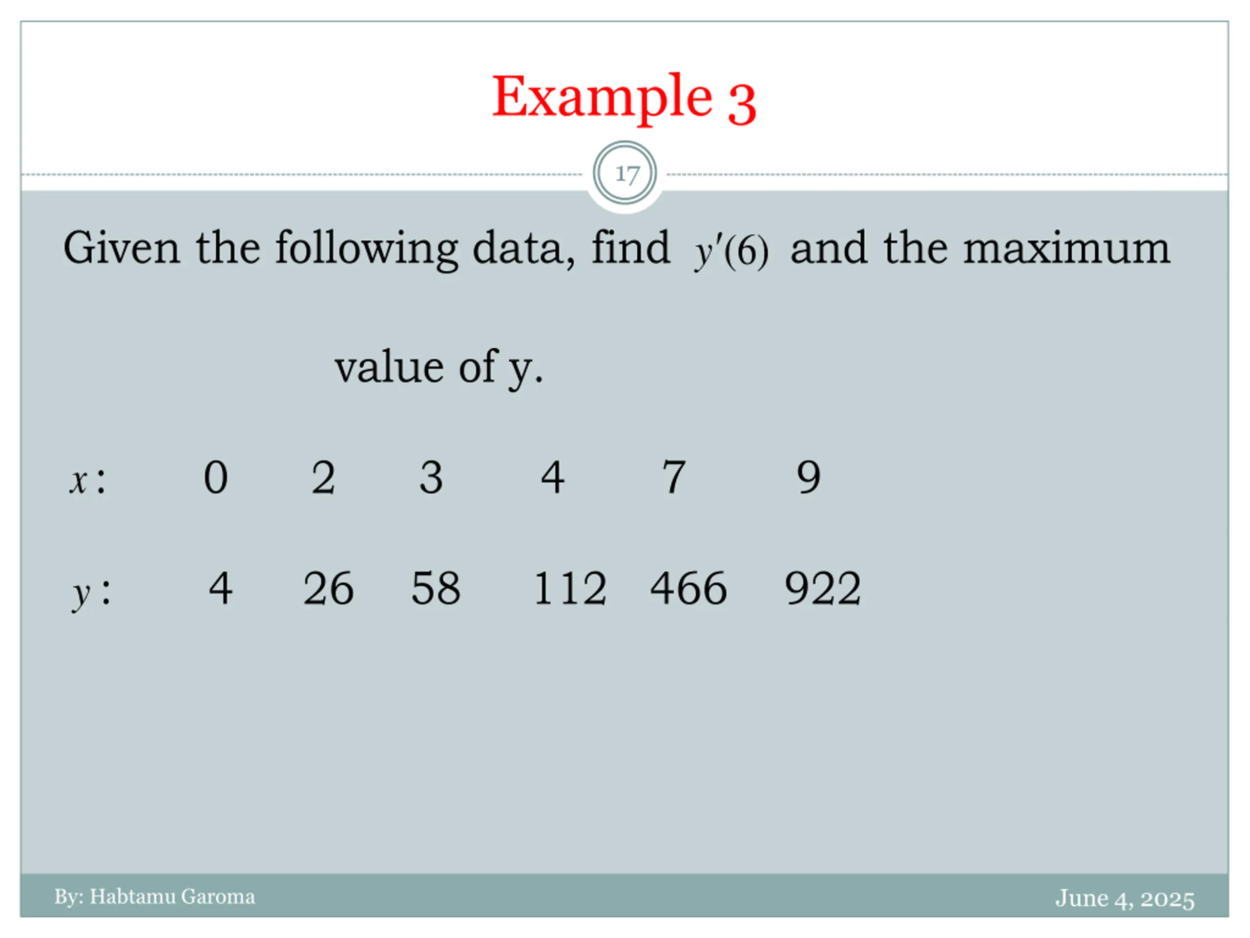 Example 3 17 ) 6 ( y Given the following data, find and the maximum value of y. x: 0 2 3 4 7 9 y: 4 26 58 112 466 922 June 4, 2025 By: Habtamu Garoma