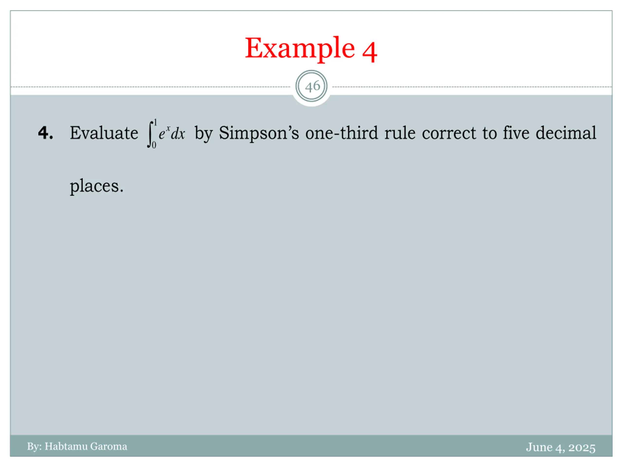 Example 4 46 1 4.Evaluate by Simpson s one-third rule correct to five decimal ex dx 0 places. June 4, 2025 By: Habtamu Garoma