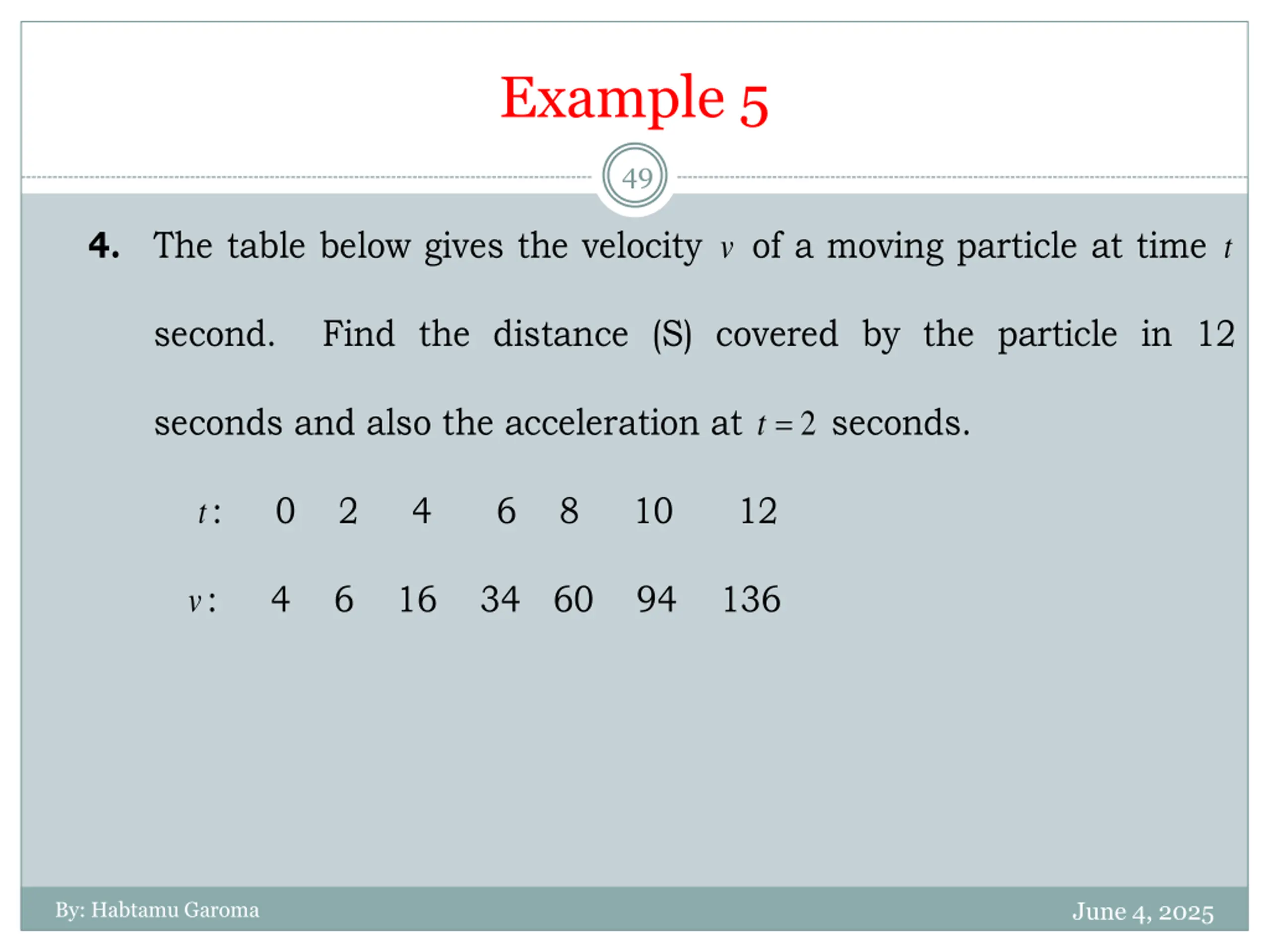 Example 5 49 4.The table below gives the velocity v of a moving particle at time t second. Find the distance (S) covered by the particle in 12 = seconds and also the acceleration at seconds. 2 t t: 0 2 4 6 8 10 12 v: 4 6 16 34 60 94 136 June 4, 2025 By: Habtamu Garoma