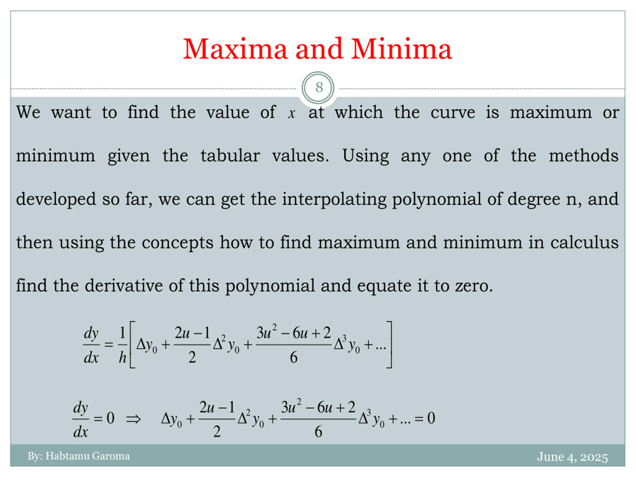 Maxima and Minima 8 We want to find the value of x at which the curve is maximum or minimum given the tabular values. Using any one of the methods developed so far, we can get the interpolating polynomial of degree n, and then using the concepts how to find maximum and minimum in calculus find the derivative of this polynomial and equate it to zero. + 2 1 h 2 1 3 6 2 dy u u u = + + + 2 3 ... y y y 0 0 0 2 6 dx + 2 2 1 3 6 2 dy u u u = + + + = 2 3 0 ... 0 y y y 0 0 0 2 6 dx June 4, 2025 By: Habtamu Garoma