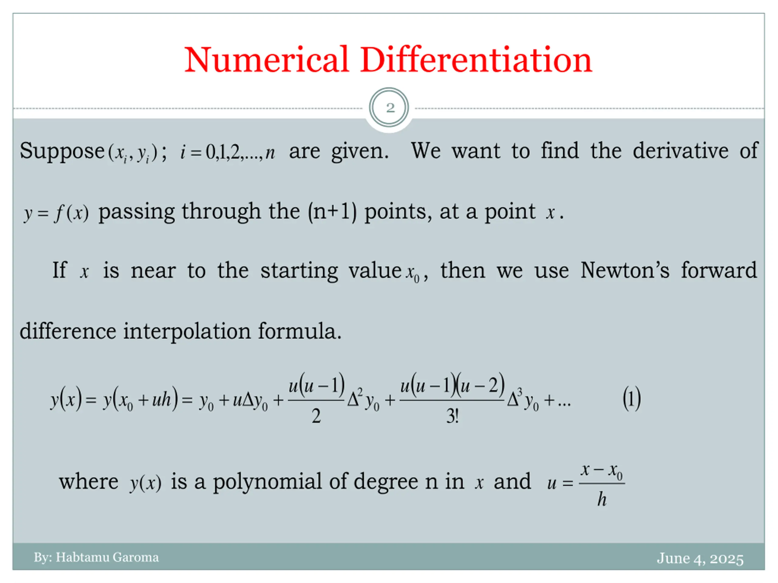 Numerical Differentiation 2 Suppose ; are given. We want to find the derivative of = ( , ) iy x 2 , 1 , 0 ,..., i n i passing through the (n+1) points, at a point x. y = (x ) f If x is near to the starting value 0x , then we use Newton s forward difference interpolation formula. ( ) ( )( ) 1 1 2 u u u u u ( ) y ( ) ( ) 1 = + = + + + + 2 3 ... x y x uh y u y y y 0 0 0 0 0 2 ! 3 x x where is a polynomial of degree n in x and = 0 (x ) u y h June 4, 2025 By: Habtamu Garoma