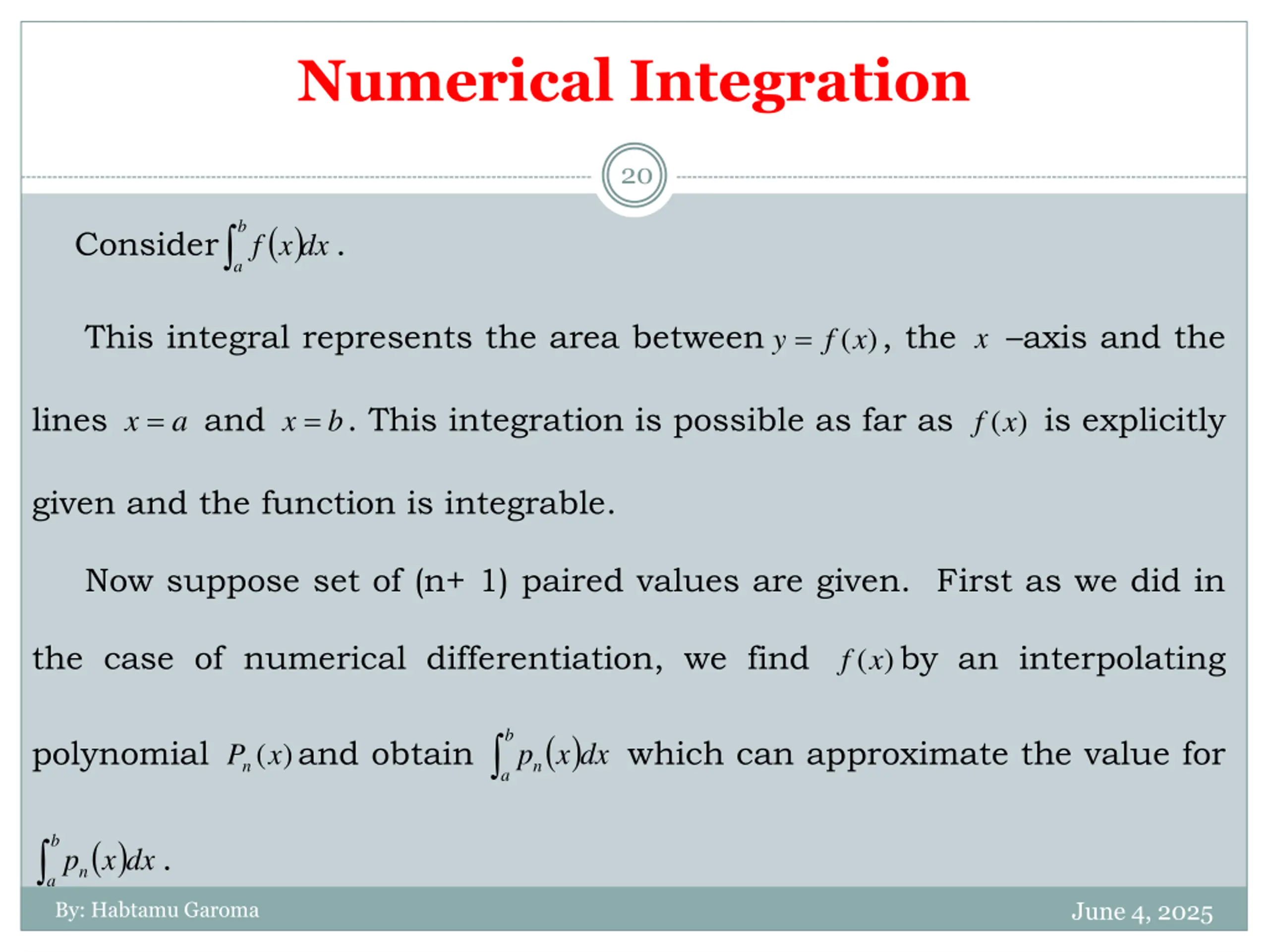 Numerical Integration 20 ( )dx x b a Consider . f This integral represents the area between , the x axis and the y = (x ) f x = and x = . This integration is possible as far as lines is explicitly a b (x ) f given and the function is integrable. Now suppose set of (n+ 1) paired values are given. First as we did in the case of numerical differentiation, we find by an interpolating (x ) f ( )dx x b polynomial and obtain which can approximate the value for p (x ) Pn n a ( )dx x b . p n a June 4, 2025 By: Habtamu Garoma