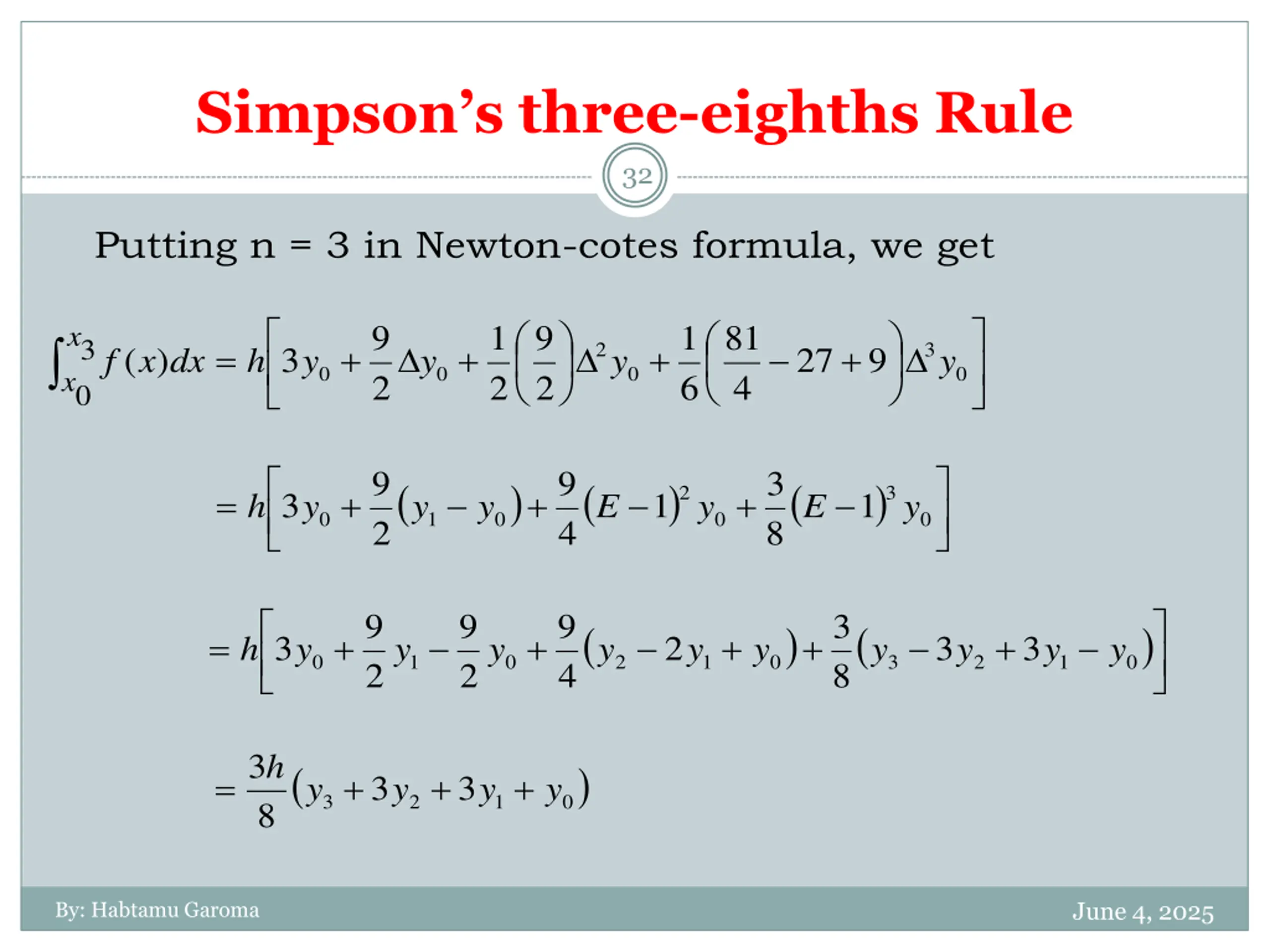 Simpsons three-eighths Rule 32 Putting n = 3 in Newton-cotes formula, we get 9 1 9 1 81 x x 3 0 = + + + + 2 3 ( ) 3 27 9 f x dx h y y y y 0 0 0 0 2 2 2 6 4 9 9 3 ( ) ( ) ( ) 2 3 = + + + 3 1 1 h y y y E y E y 0 1 0 0 0 2 4 8 9 9 9 3 ( ) ( ) = + + + + + 3 2 3 3 h y y y y y y y y y y 0 1 0 2 1 0 3 2 1 0 2 2 4 8 3 h ( ) = + + + 3 3 y y y y 3 2 1 0 8 June 4, 2025 By: Habtamu Garoma