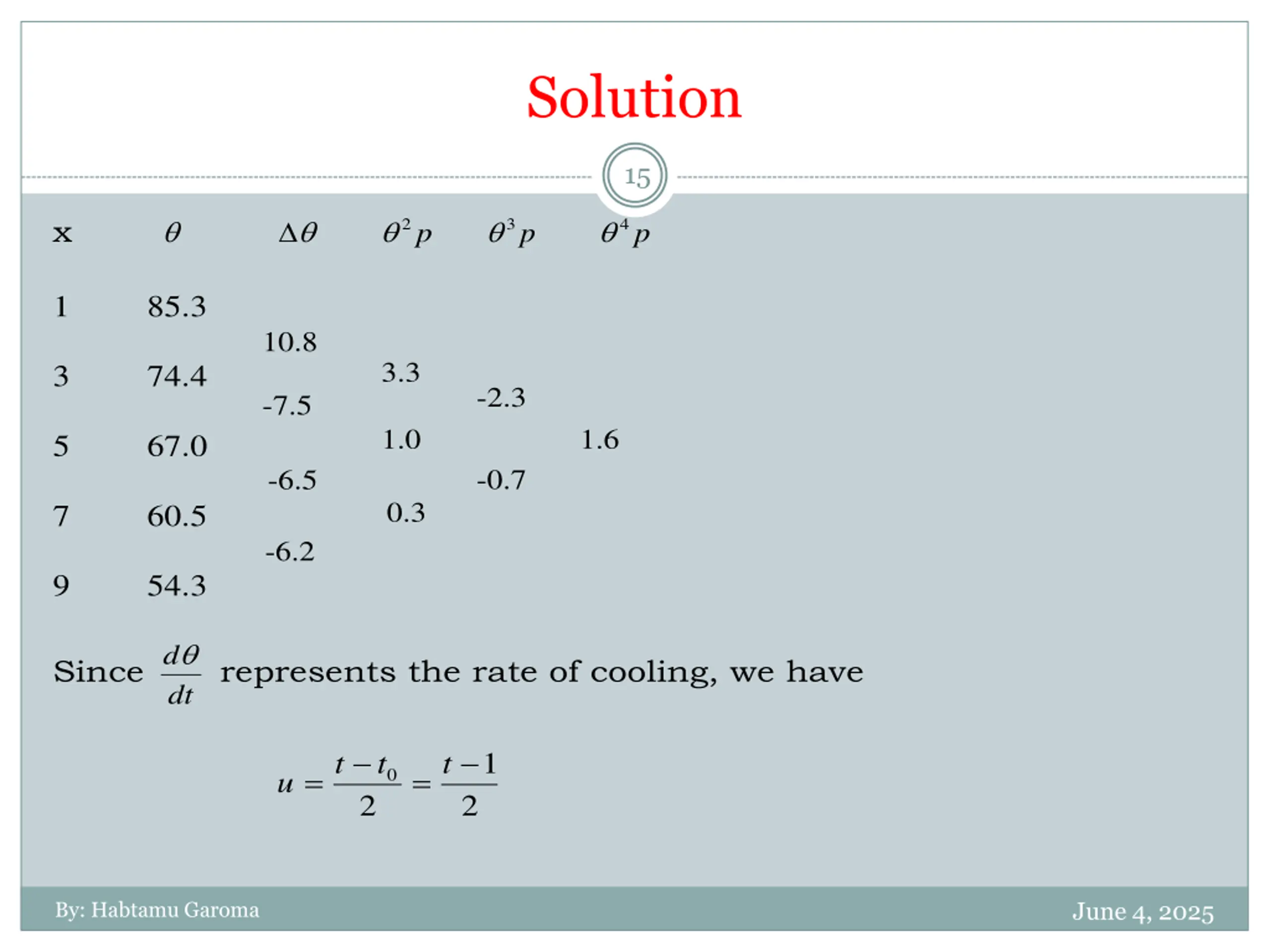 Solution 15 x 2 4 3 p p p 1 85.3 10.8 3.3 3 74.4 -2.3 -7.5 1.0 1.6 5 67.0 -0.7 -6.5 0.3 7 60.5 -6.2 9 54.3 d represents the rate of cooling, we have Since dt 1 t t t = = 0 u 2 2 June 4, 2025 By: Habtamu Garoma