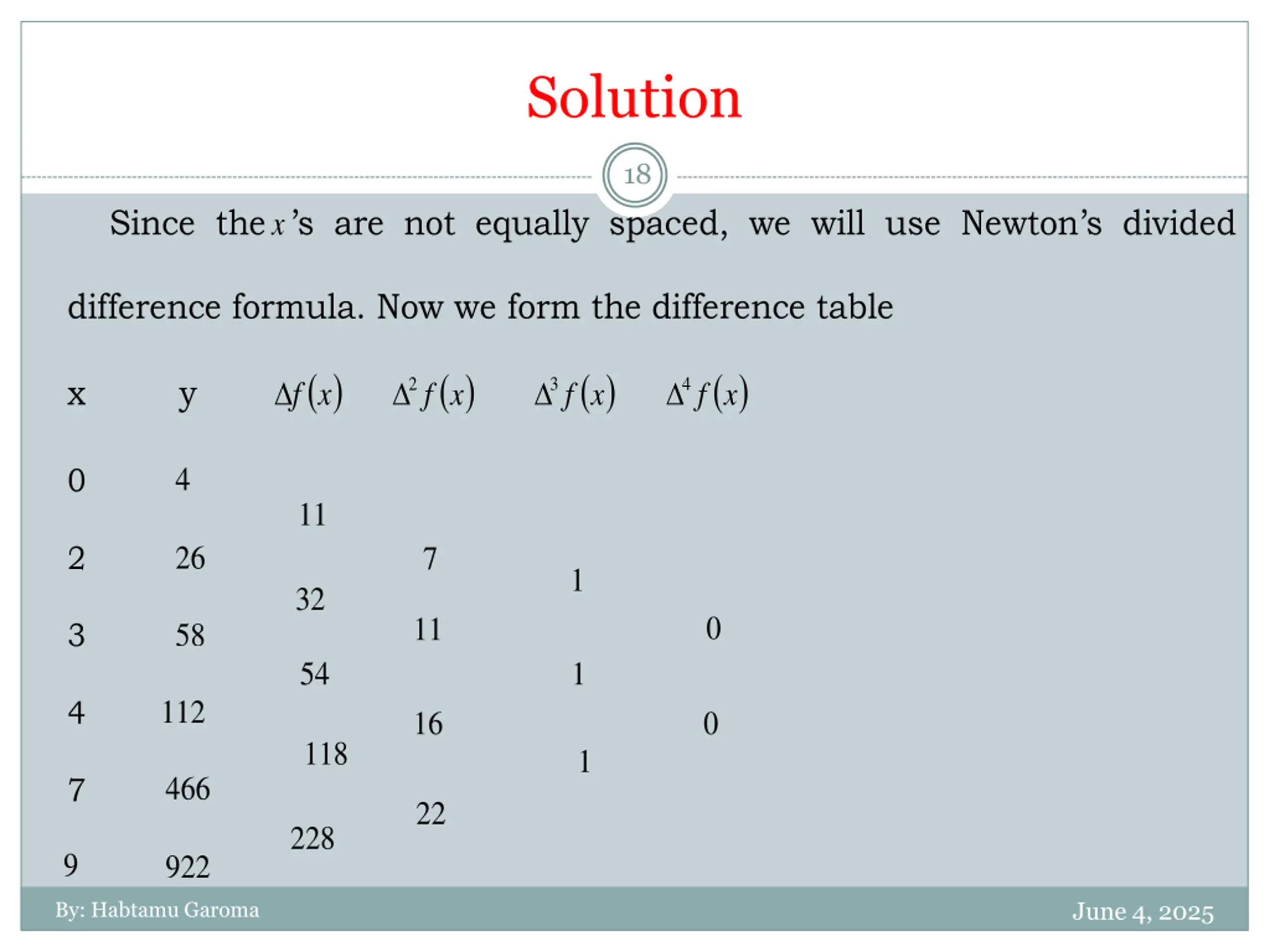 Solution 18 Since thex s are not equally spaced, we will use Newton s divided difference formula. Now we form the difference table ( ) x ( ) x ( ) x ( ) x f x y 2 3 4 f f f 4 0 11 2 26 7 1 32 0 11 3 58 54 1 112 4 16 0 118 1 7 466 22 228 9 922 June 4, 2025 By: Habtamu Garoma
