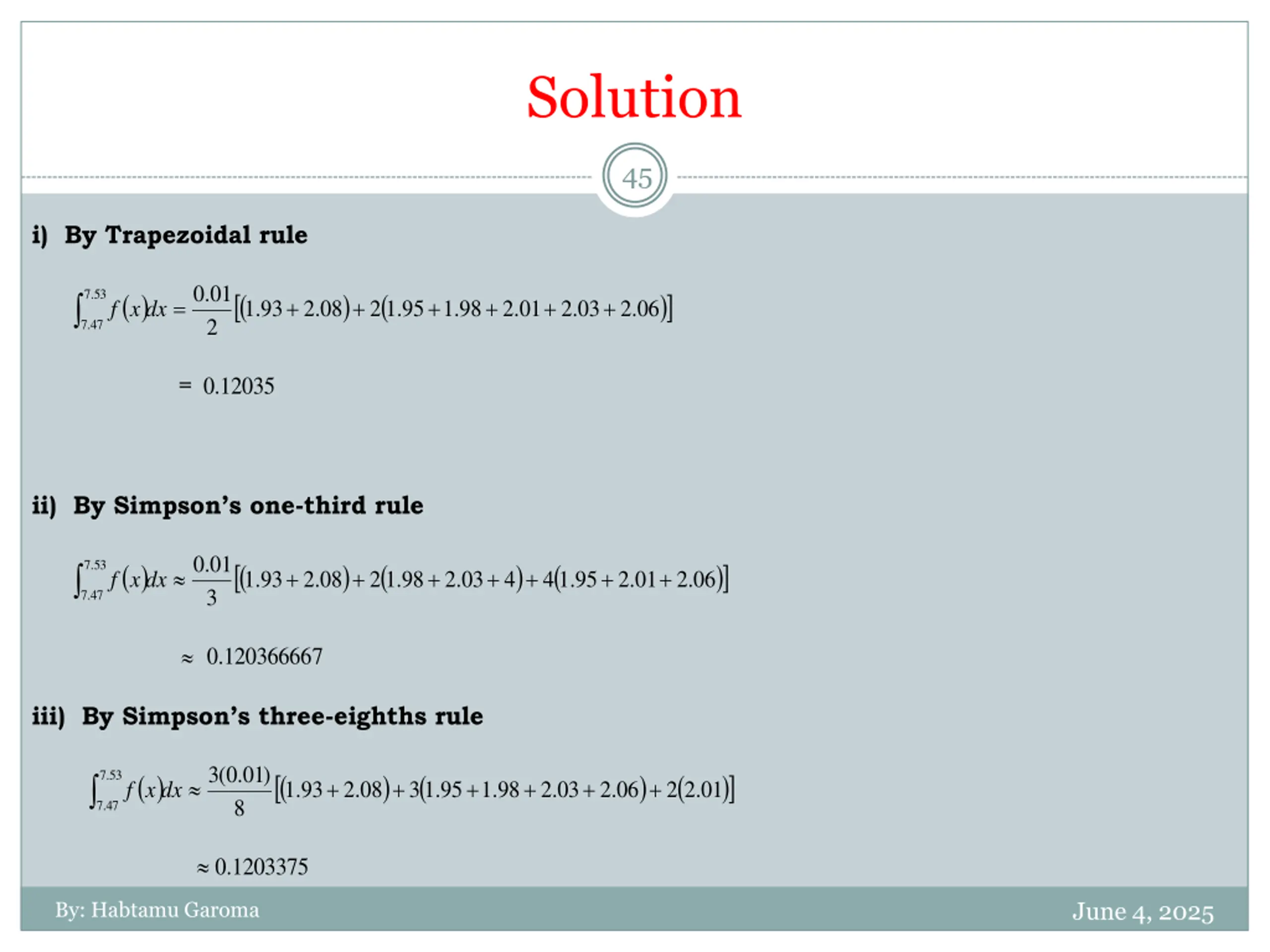 Solution 45 i) By Trapezoidal rule . 0 01 ( ) x ( . 1 ) ( . 1 ) . 7 53 . 7 = + + . 1 + + + + 93 . 2 08 2 95 98 . 2 01 . 2 03 . 2 06 f dx 2 47 = 0.12035 ii) By Simpson s one-third rule . 0 01 ( ) x ( . 1 ) ( . 1 ) ( . 1 ) . 7 53 . 7 + + + + + + + 93 . 2 08 2 98 . 2 03 4 4 95 . 2 01 . 2 06 f dx 3 47 0.12036666 7 iii) By Simpson s three-eighths rule . 0 ( 3 01 ) ( ) x ( . 1 ) ( . 1 3 ) ( . 2 2 ) . 7 53 . 7 + + . 1 + + + + 93 . 2 08 95 98 . 2 03 . 2 06 01 f dx 8 47 1203375 . 0 June 4, 2025 By: Habtamu Garoma