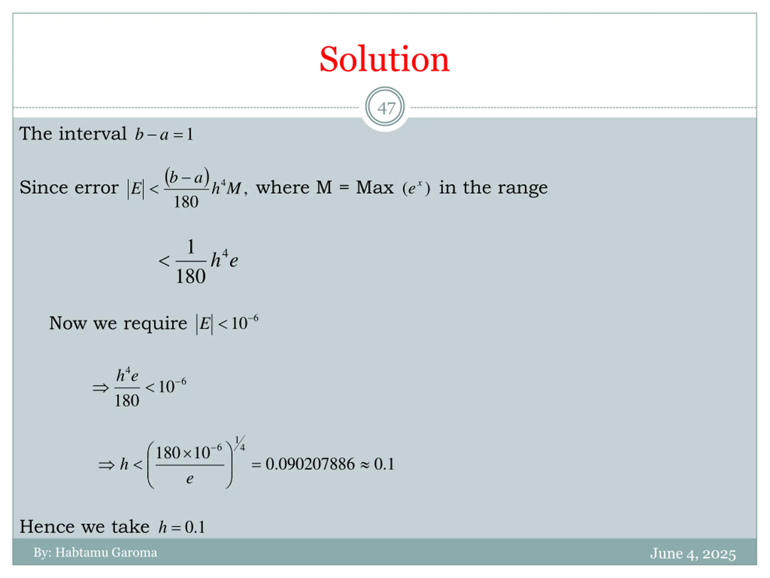 Solution 47 a = The interval 1 b ( ) b a Since error where M = Max in the range x 4M ( ) e , E h 180 1 h4 e 180 10 Now we require 6 E 4 h e 6 10 180 1 6 4 180 10 e = 090207886 . 0 1 . 0 h = Hence we take 1 . 0 h June 4, 2025 By: Habtamu Garoma