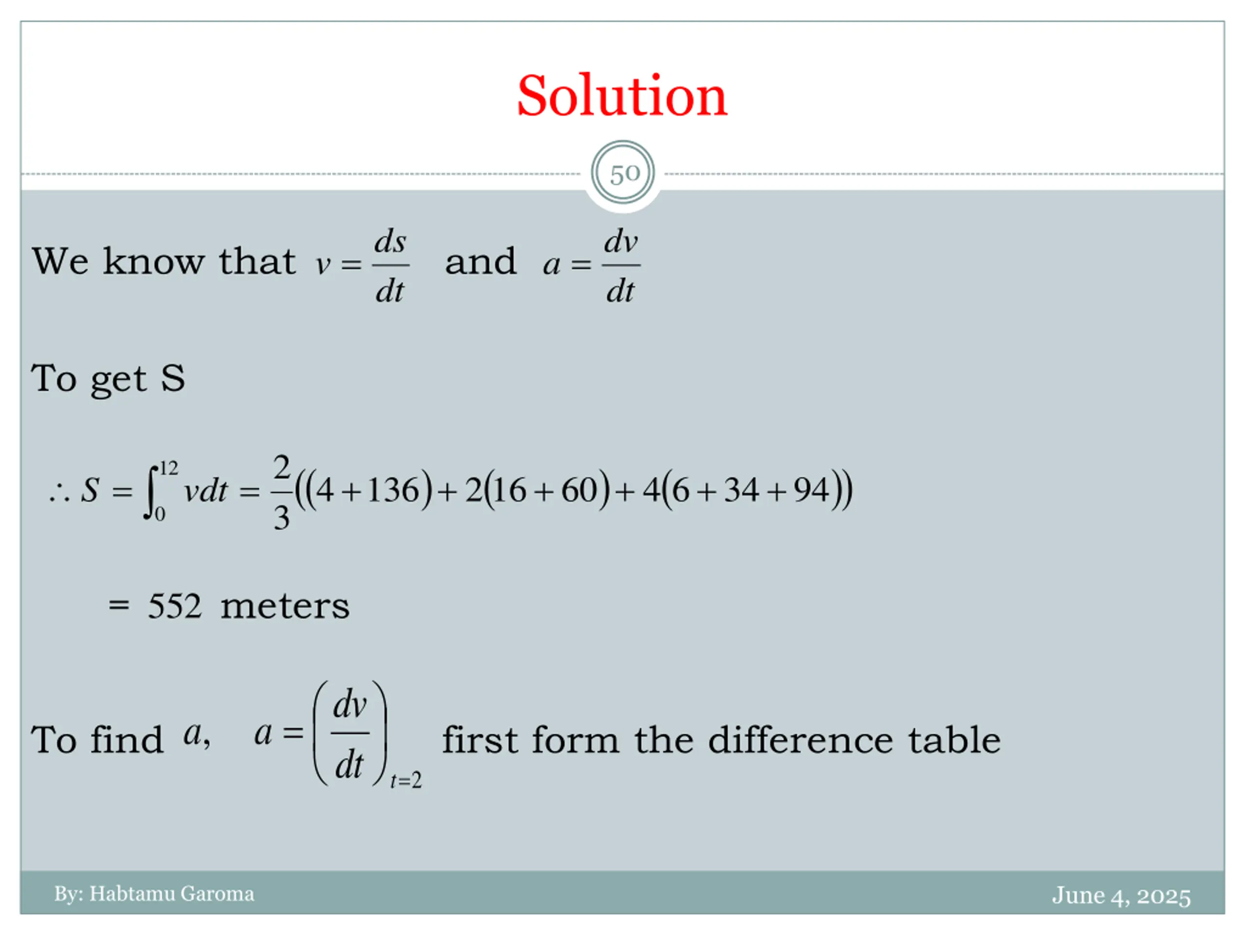 Solution 50 ds dv We know that and v = a = dt dt To get S 2 ( ( ) ( ) ( ) ) 12 vdt = = + + + + + + 4 136 2 16 60 4 6 34 94 S 3 0 = 552 meters dv = , a a To find first form the difference table dt = 2 t June 4, 2025 By: Habtamu Garoma