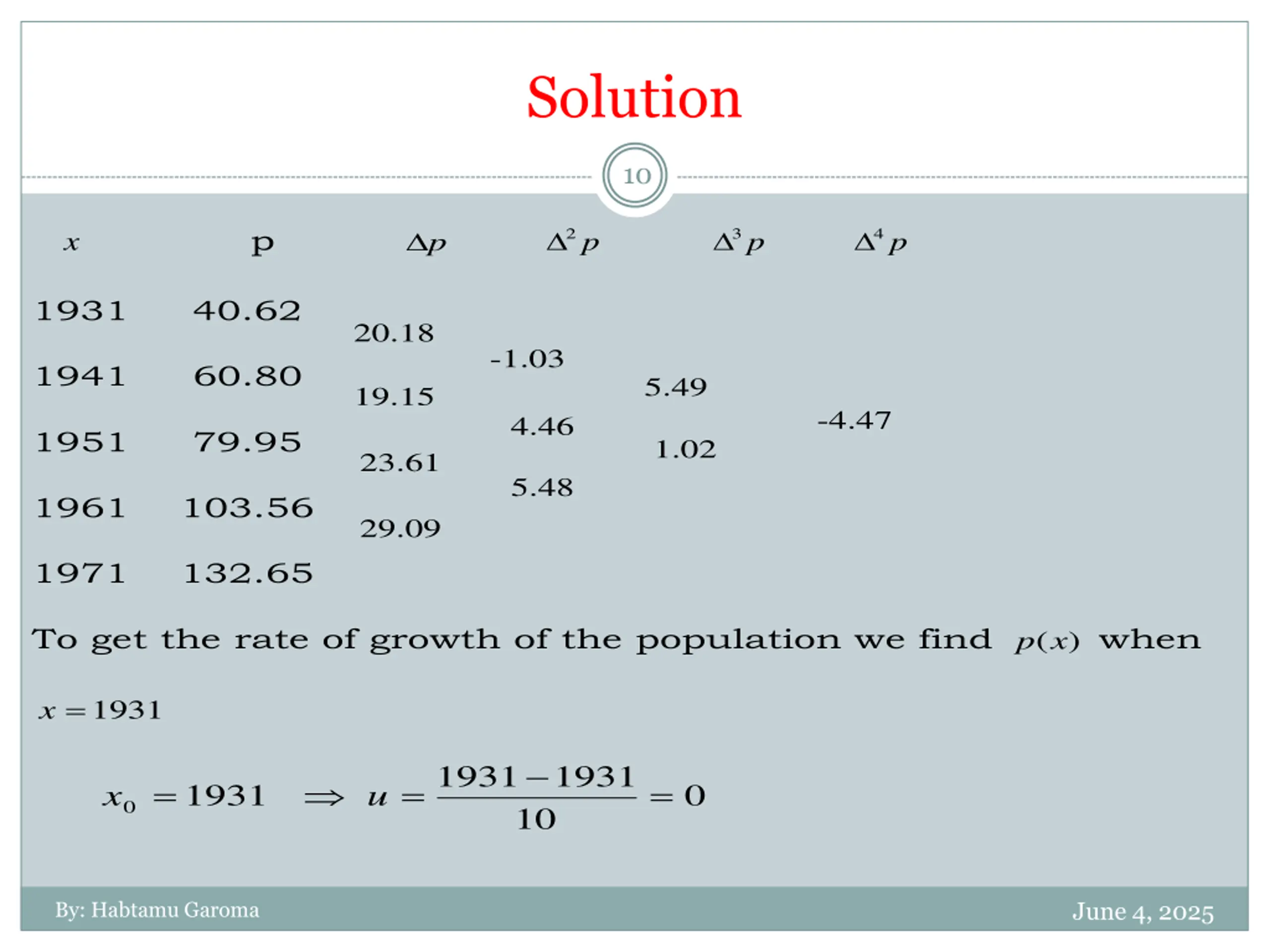 Solution 10 x p 2 3 4 p p p p 1931 40.62 20.18 -1.03 1941 60.80 5.49 19.15 -4.47 4.46 1951 79.95 1.02 23.61 5.48 1961 103.56 29.09 1971 132.65 To get the rate of growth of the population we find when (x ) p = 1931 x 1931 1931 = = = 1931 0 x u 0 10 June 4, 2025 By: Habtamu Garoma