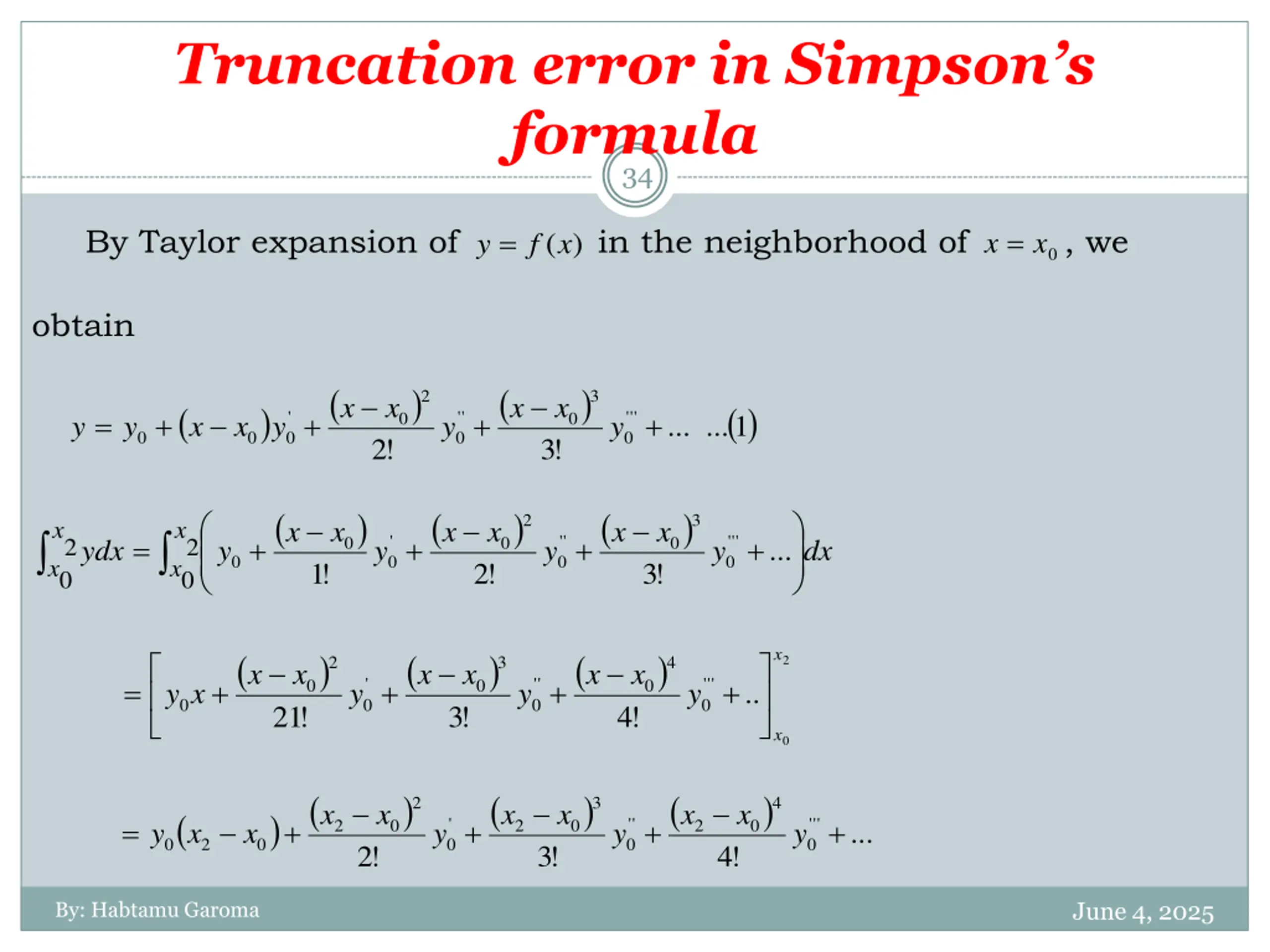 Truncation error in Simpsons formula 34 By Taylor expansion of in the neighborhood of , we x = y = 0 x (x ) f obtain ( ) ( ) 2 3 x x x x ( ) ( ) 1 = + + + + ' ' ' 0 ' ' ' 0 0 0 ... ... y y x x y y y 0 0 0 ! 2 ! 3 ( ) ( ) ( ) 2 3 ! 1 ! 2 ! 3 x x x x x x x x x x dx = + + + + ' ' ' 0 ' ' ' 0 0 0 0 2 0 2 0 ... ydx y y y y 0 0 ( ) ( ) ( ) x 2 3 4 2 x x x x x x = + + + + ' ' ' 0 ' ' ' 0 0 0 0 .. y x y y y 0 0 21 ! ! 3 ! 4 x 0 ( ) ( ) ( ) 2 3 4 x x x x x x ( ) = + + + + ' ' ' 0 ' ' ' 0 2 0 2 0 2 0 ... y x x y y y 0 2 0 0 ! 2 ! 3 ! 4 June 4, 2025 By: Habtamu Garoma