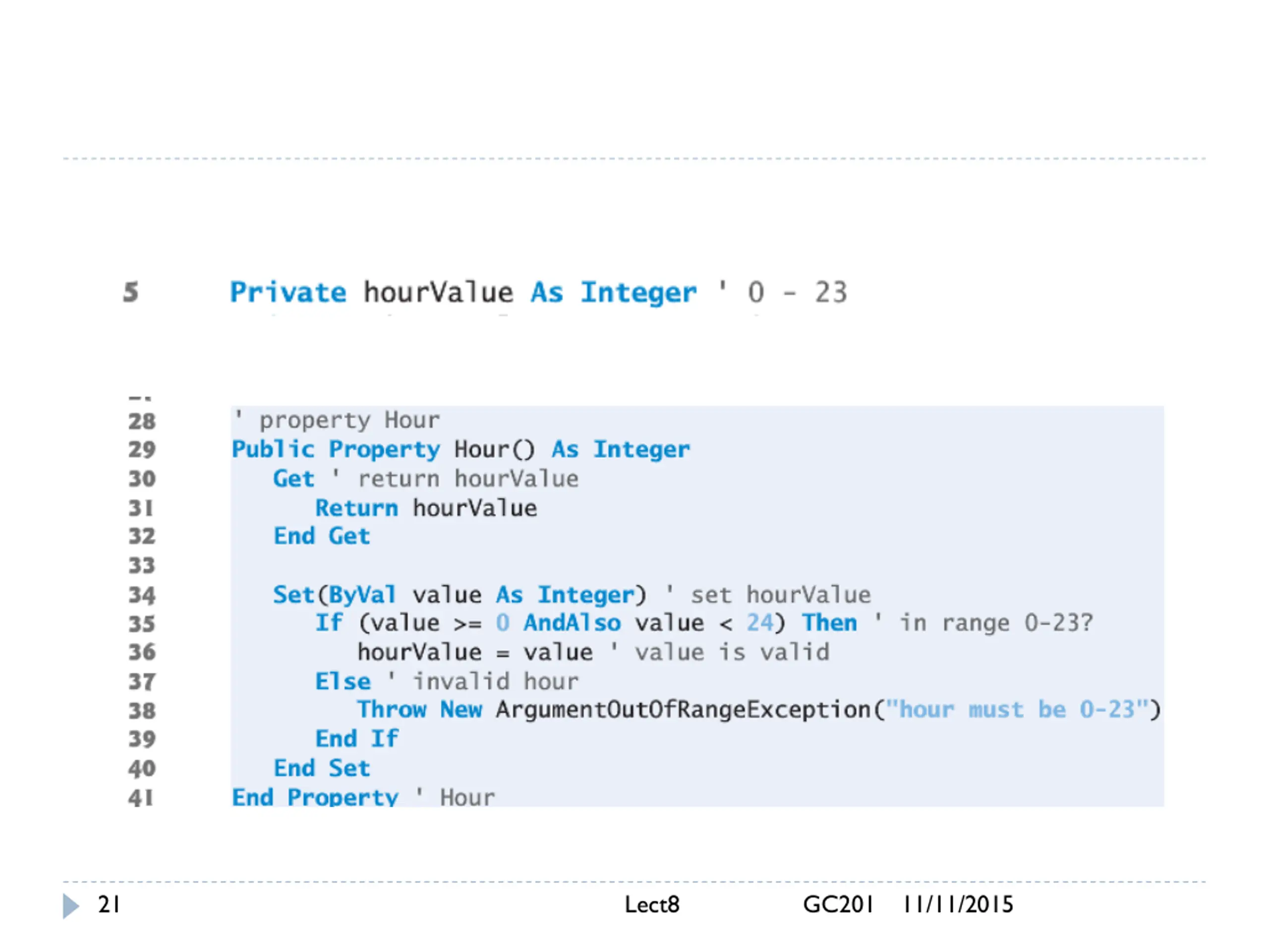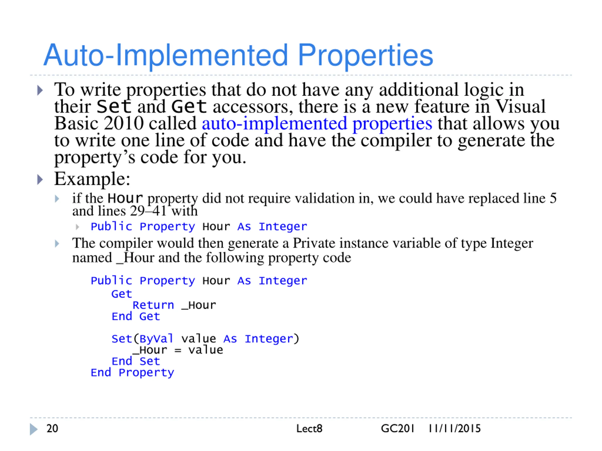 Auto-Implemented Properties To write properties that do not have any additional logic in their Set and Get accessors, there is a new feature in Visual Basic 2010 called auto-implemented properties that allows you to write one line of code and have the compiler to generate the property s code for you. Example: if the Hour property did not require validation in, we could have replaced line 5 and lines 29 41 with Public Property Hour As Integer The compiler would then generate a Private instance variable of type Integer named _Hour and the following property code Public Property Hour As Integer Get Return _Hour End Get Set(ByVal value As Integer) _Hour = value End Set End Property 20 Lect8 GC201 11/11/2015