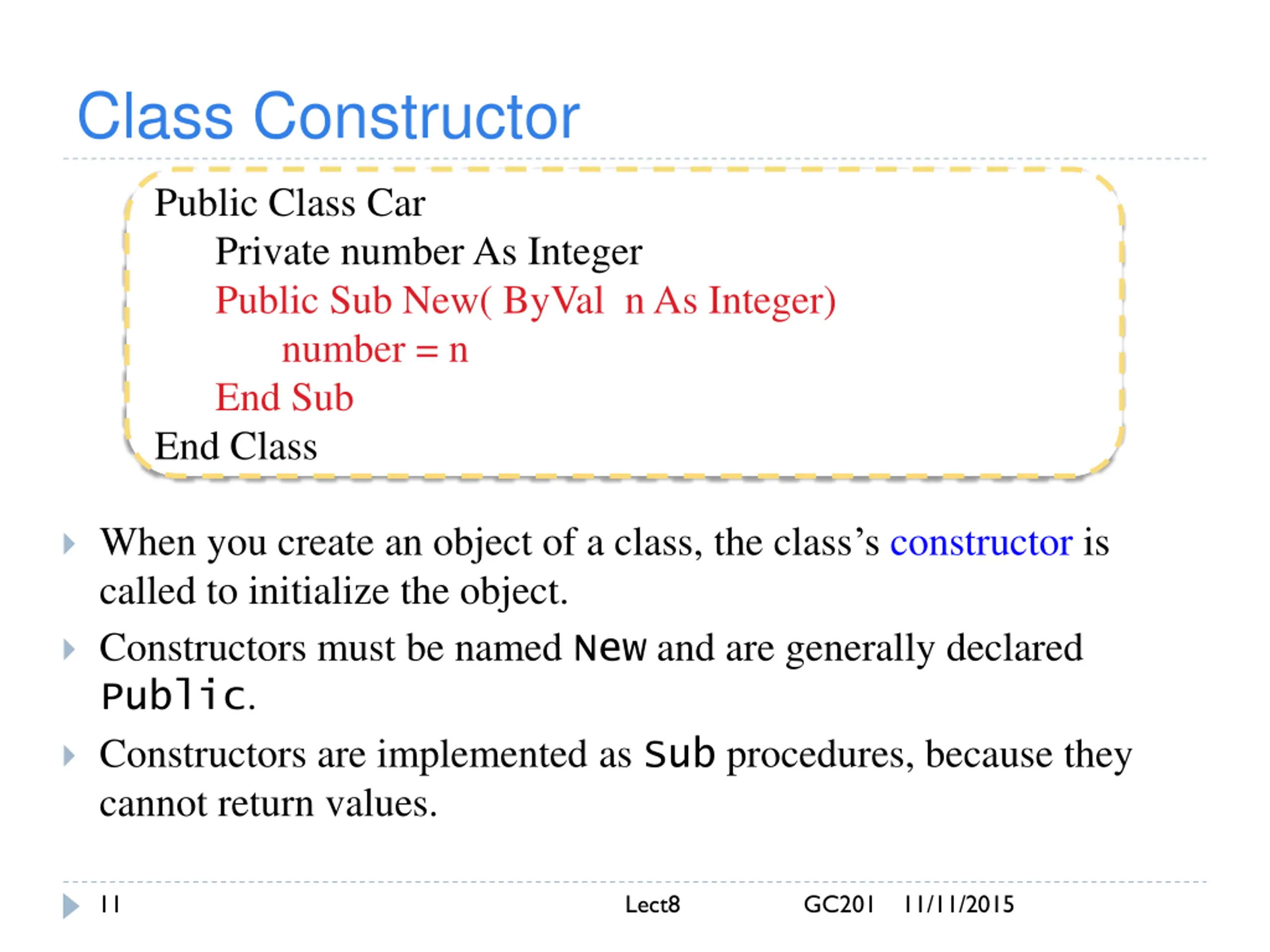 Class Constructor Public Class Car Private number As Integer Public Sub New( ByVal n As Integer) number = n End Sub End Class When you create an object of a class, the class s constructor is called to initialize the object. Constructors must be named New and are generally declared Public. Constructors are implemented as Sub procedures, because they cannot return values. 11 Lect8 GC201 11/11/2015