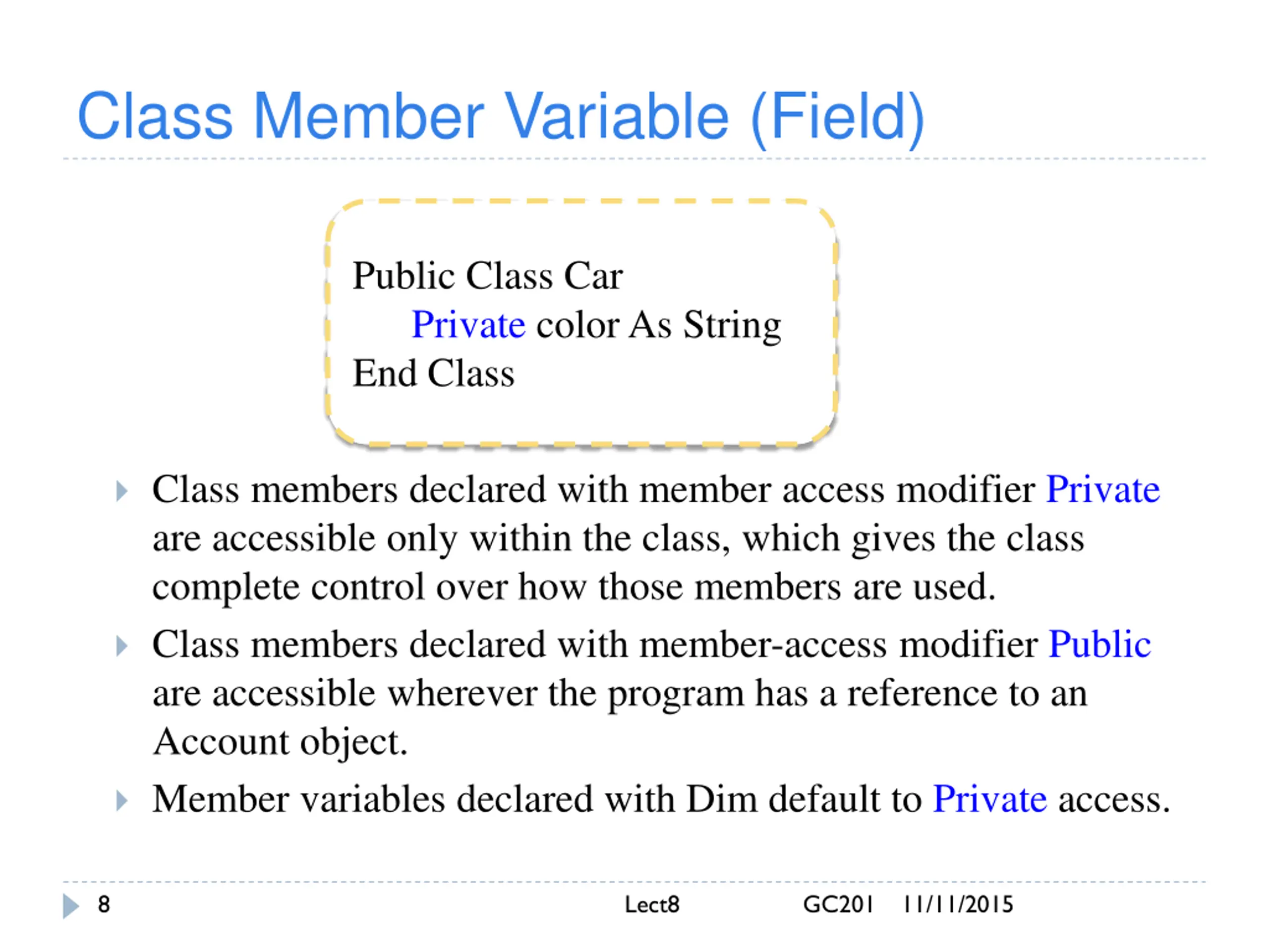Class Member Variable (Field) Public Class Car Private color As String End Class Class members declared with member access modifier Private are accessible only within the class, which gives the class complete control over how those members are used. Class members declared with member-access modifier Public are accessible wherever the program has a reference to an Account object. Member variables declared with Dim default to Private access. 8 Lect8 GC201 11/11/2015