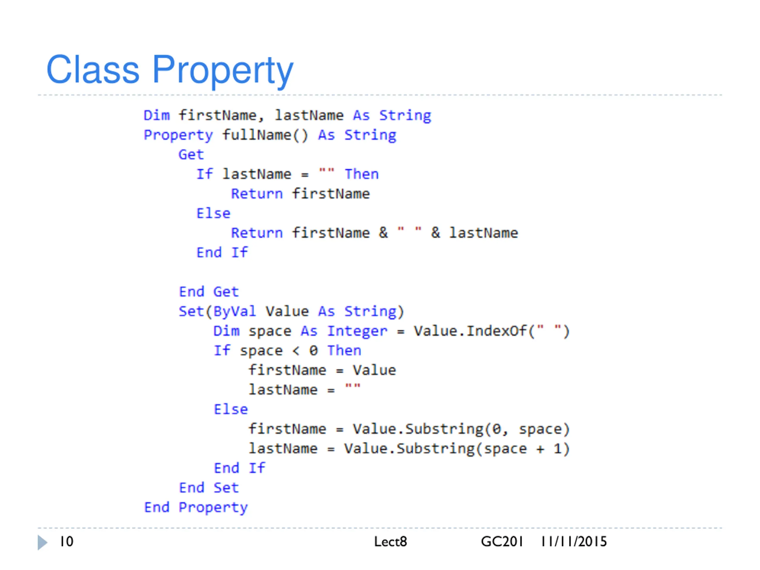 Class Property Use property procedure when: Need to control when and how a value is set or retrieved. Need to validate values. Setting the property causes changes to other internal variables or to the values of other properties. Visual Basic provides for the following property procedures: AGet procedure returns the value of a property. It is called when you access the property in an expression. ASet procedure sets a property to a value, including an object reference. It is called when you assign a value to the property. You usually define property procedures in pairs, using the Get and Set statements, but you can define either procedure alone if the property is read-only (Get Statement) or write-only (Set Statement). 9 Lect8 GC201 11/11/2015