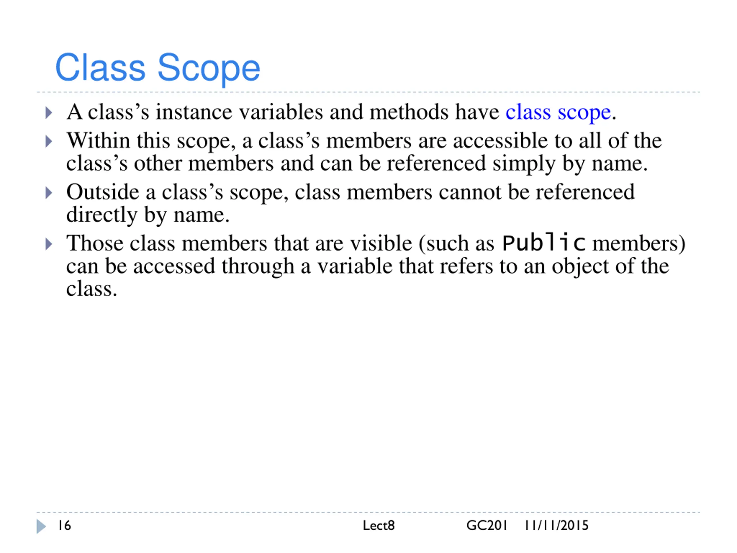 Class Scope A class s instance variables and methods have class scope. Within this scope, a class s members are accessible to all of the class s other members and can be referenced simply by name. Outside a class s scope, class members cannot be referenced directly by name. Those class members that are visible (such as Public members) can be accessed through a variable that refers to an object of the class. 16 Lect8 GC201 11/11/2015