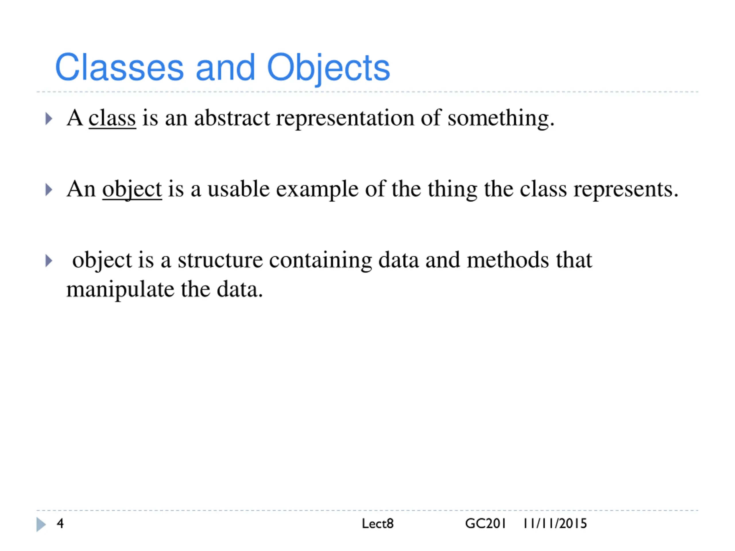 Classes and Objects A class is an abstract representation of something. An object is a usable example of the thing the class represents. object is a structure containing data and methods that manipulate the data. 4 Lect8 GC201 11/11/2015
