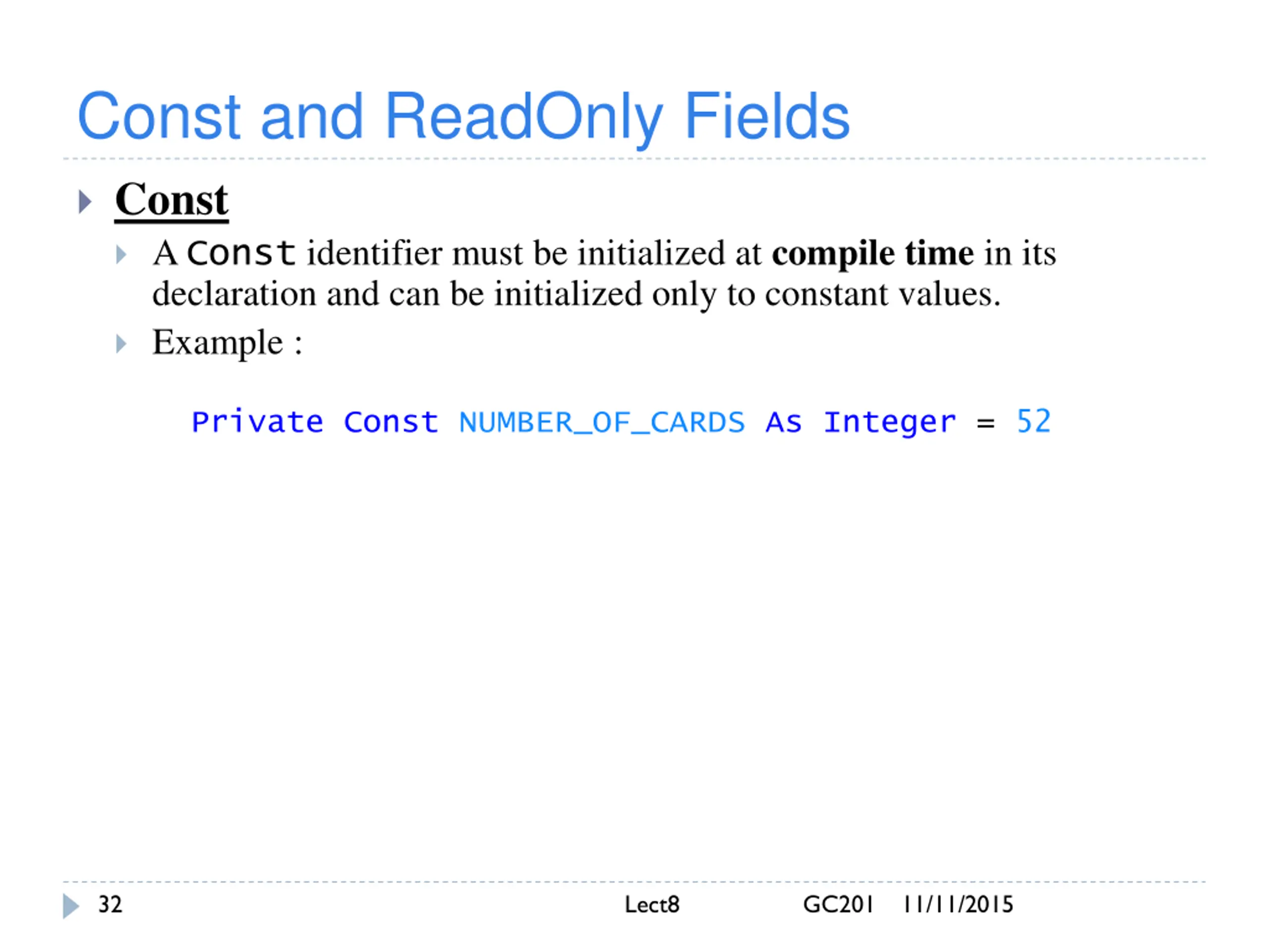 Const and ReadOnly Fields Const A Const identifier must be initialized at compile time in its declaration and can be initialized only to constant values. Example : Private Const NUMBER_OF_CARDS As Integer = 52 32 Lect8 GC201 11/11/2015