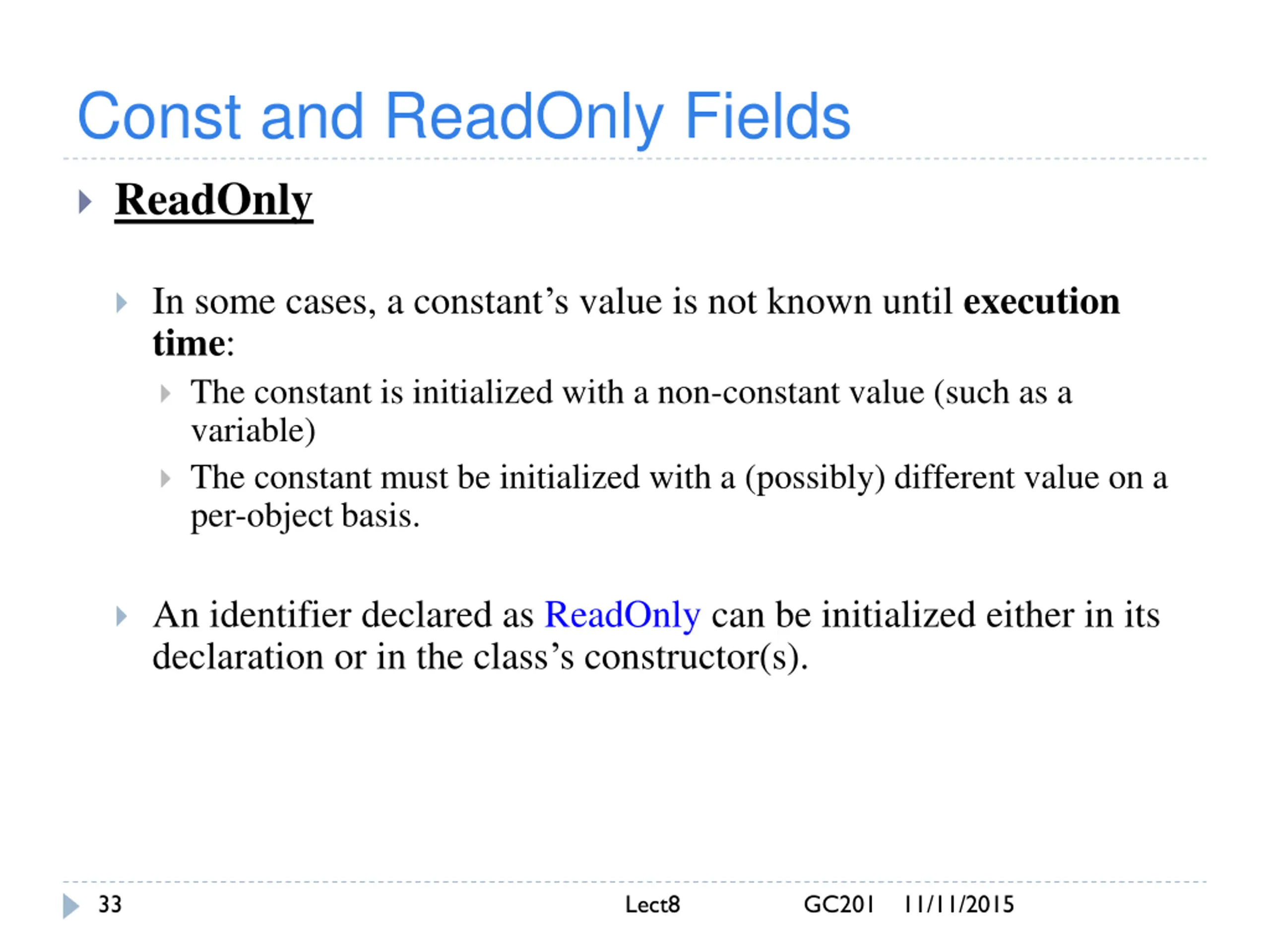 Const and ReadOnly Fields Constants are fields whose values cannot change during program execution. To create a constant in a class, declare an identifier as either Const or ReadOnly. Neither type of constant can be modified once initialized. 31 Lect8 GC201 11/11/2015