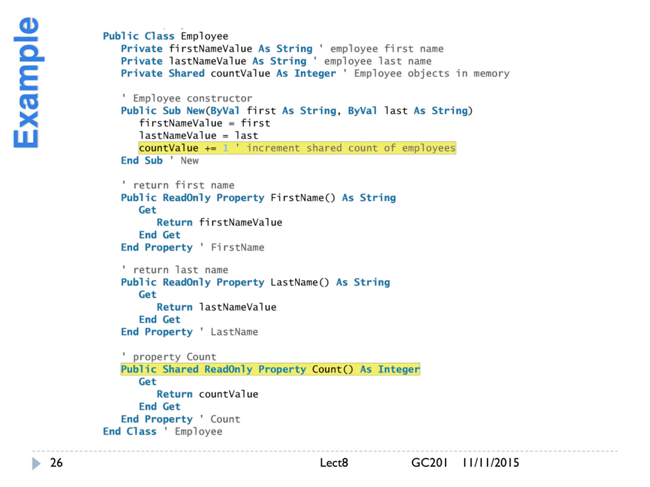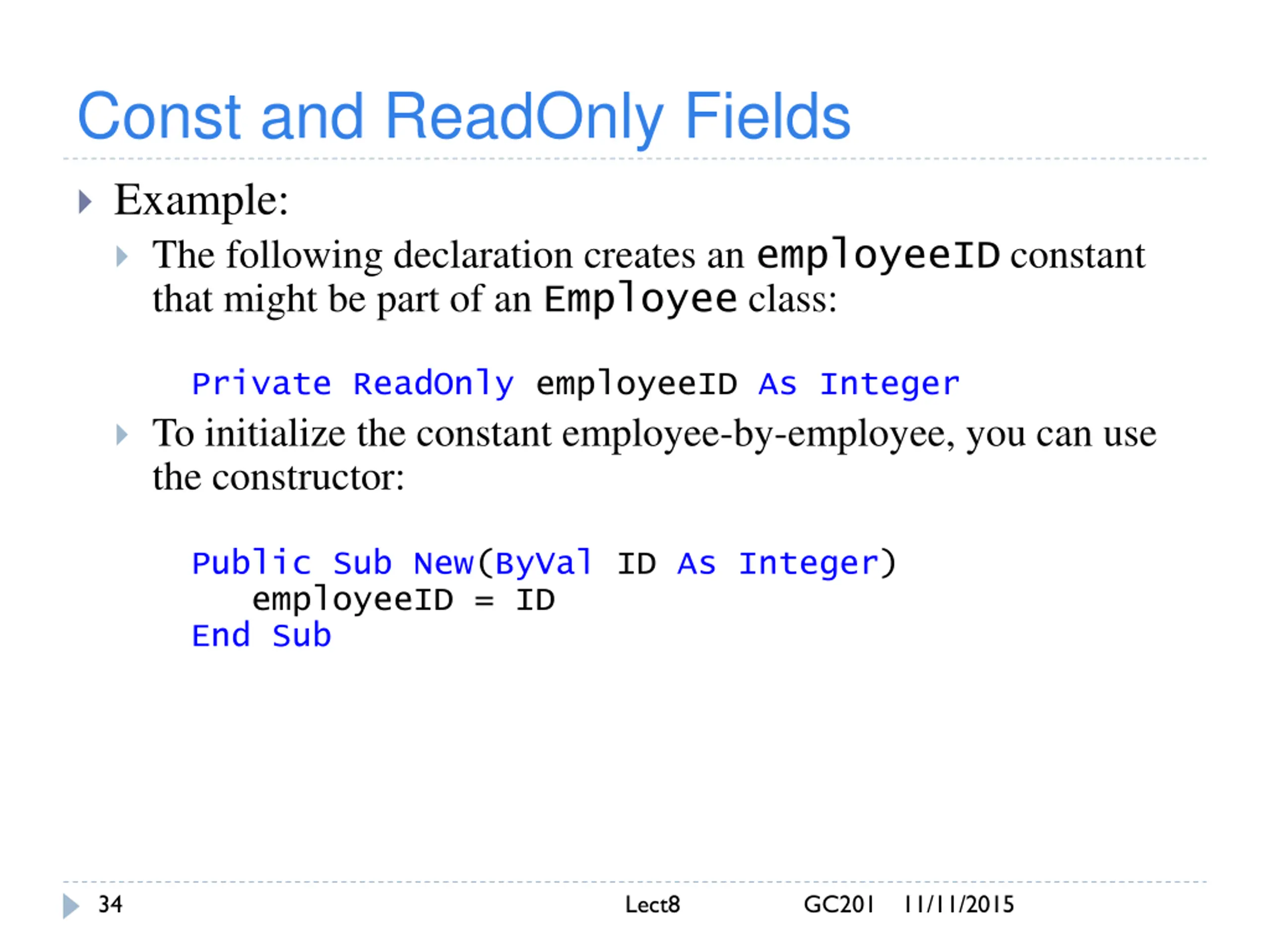 Const and ReadOnly Fields Example: The following declaration creates an employeeID constant that might be part of an Employee class: Private ReadOnly employeeID As Integer To initialize the constant employee-by-employee, you can use the constructor: Public Sub New(ByVal ID As Integer) employeeID = ID End Sub 34 Lect8 GC201 11/11/2015