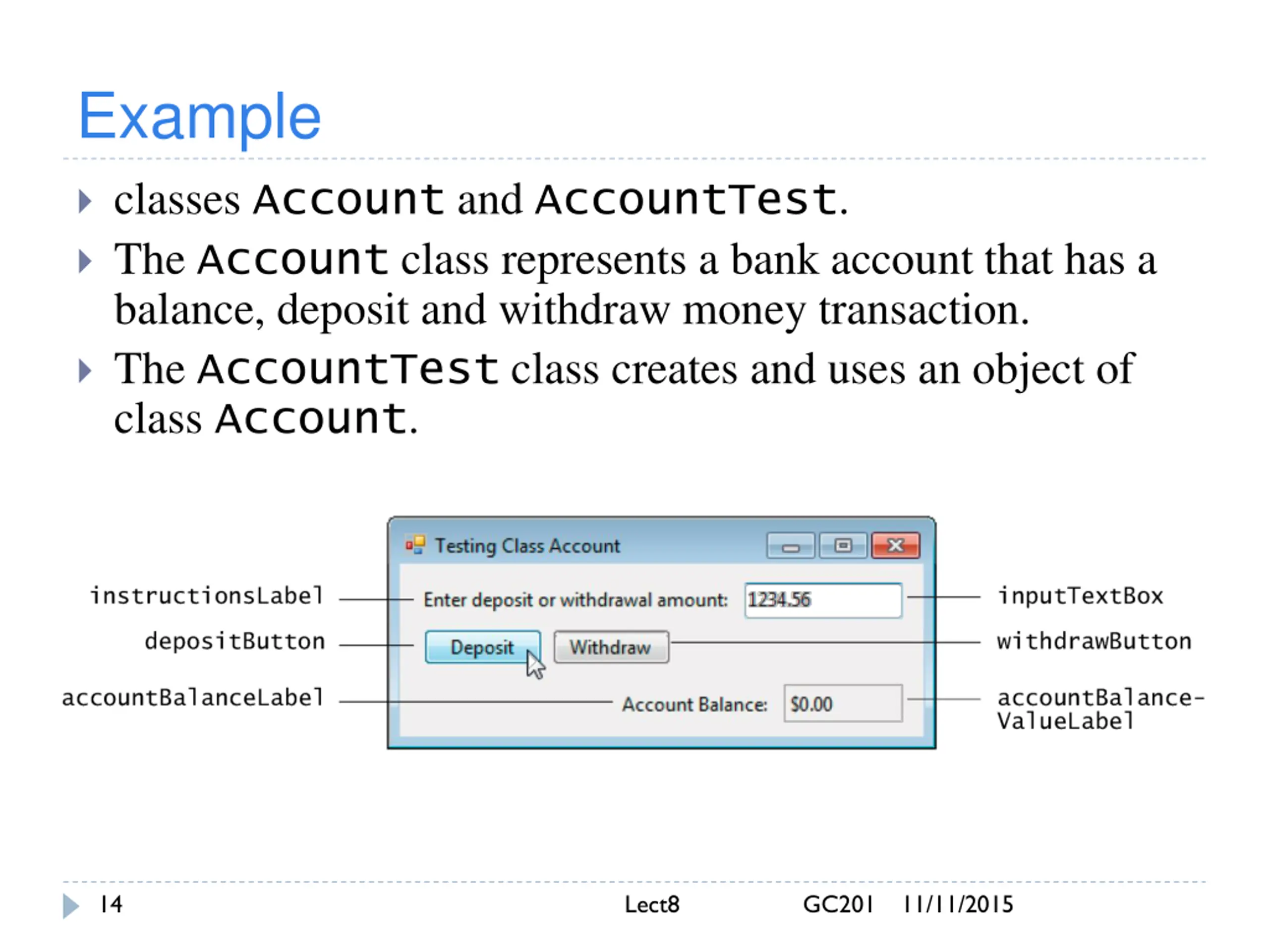 Example classes Account and AccountTest. The Account class represents a bank account that has a balance, deposit and withdraw money transaction. The AccountTest class creates and uses an object of class Account. 14 Lect8 GC201 11/11/2015