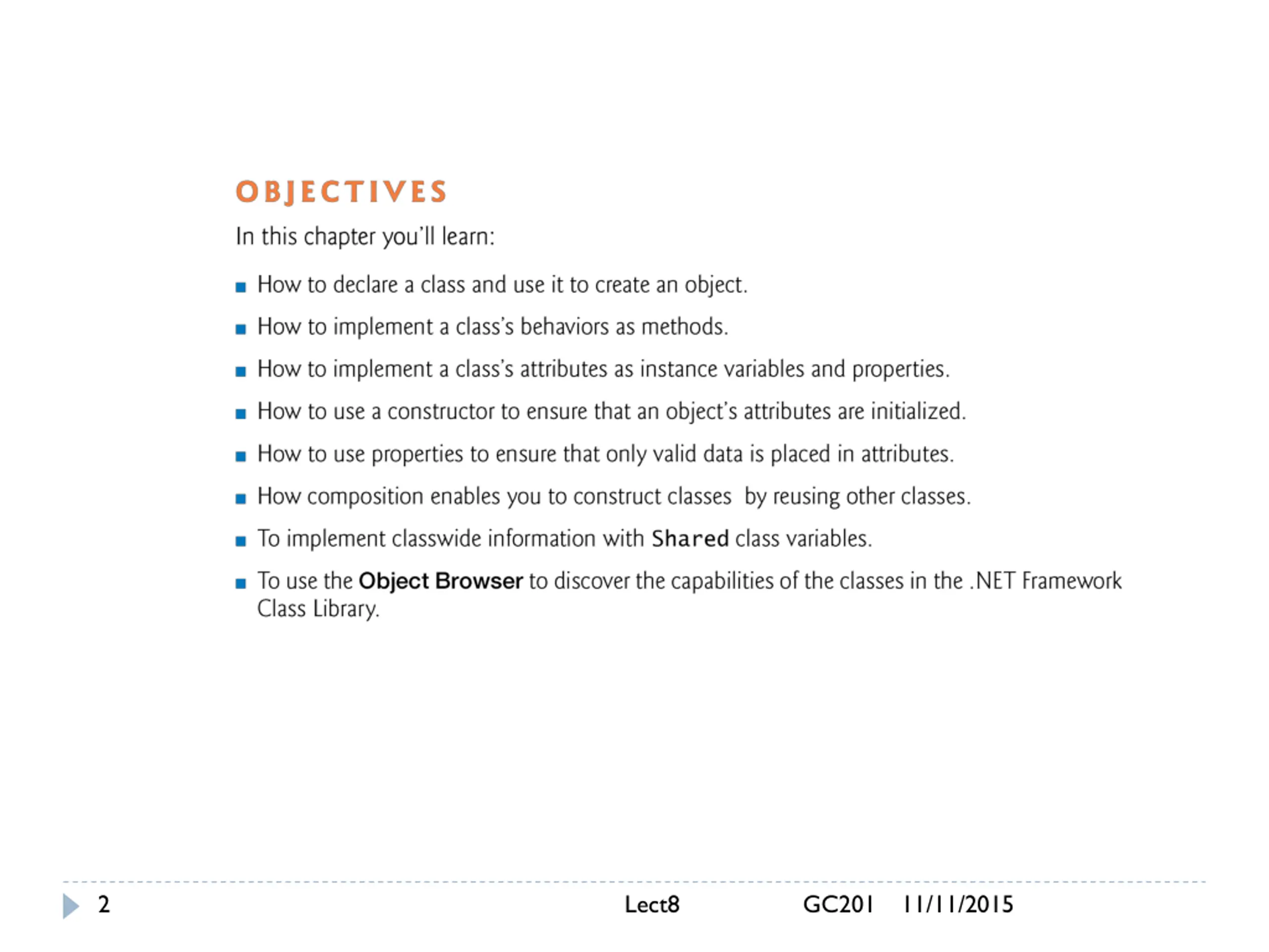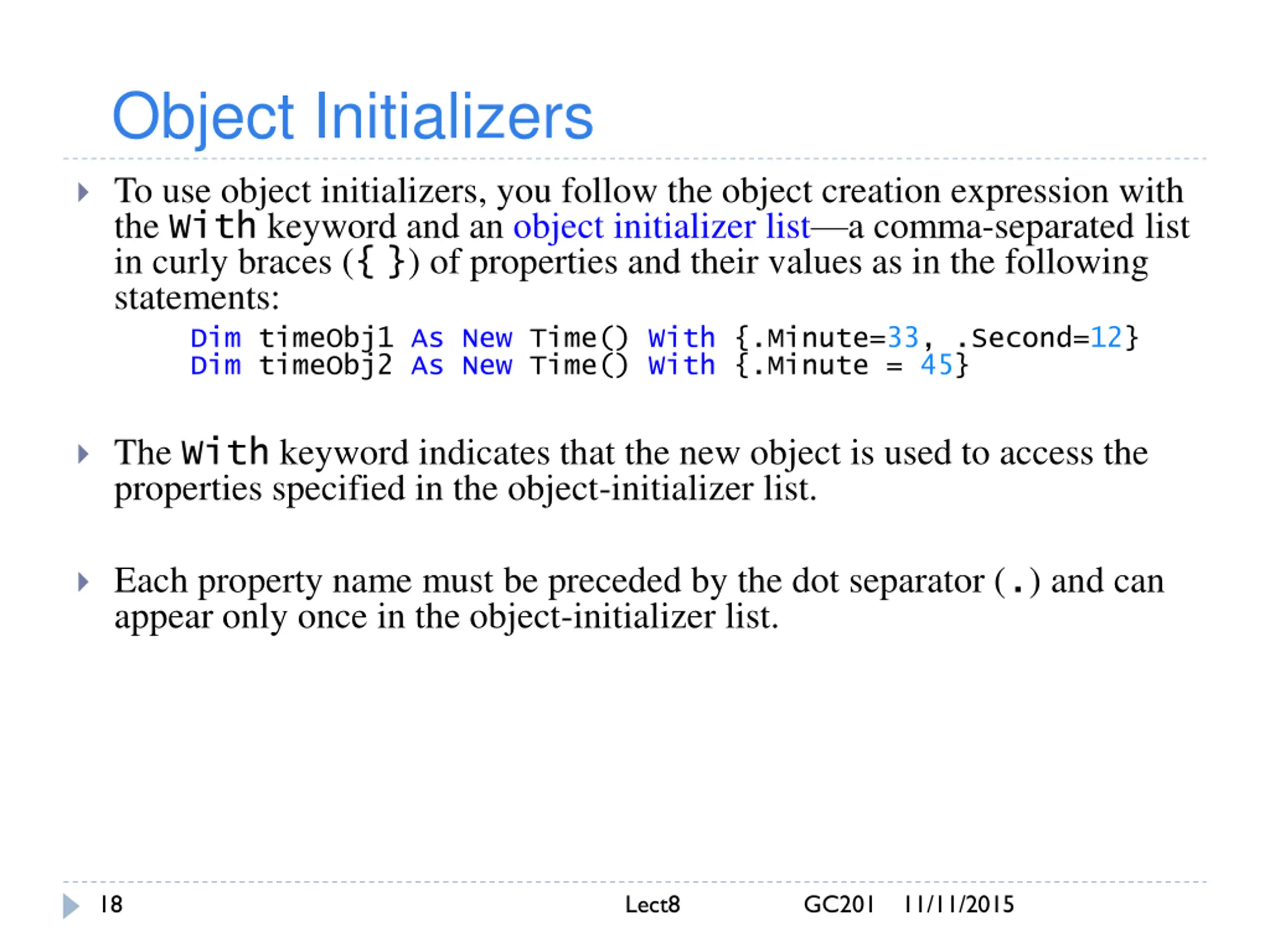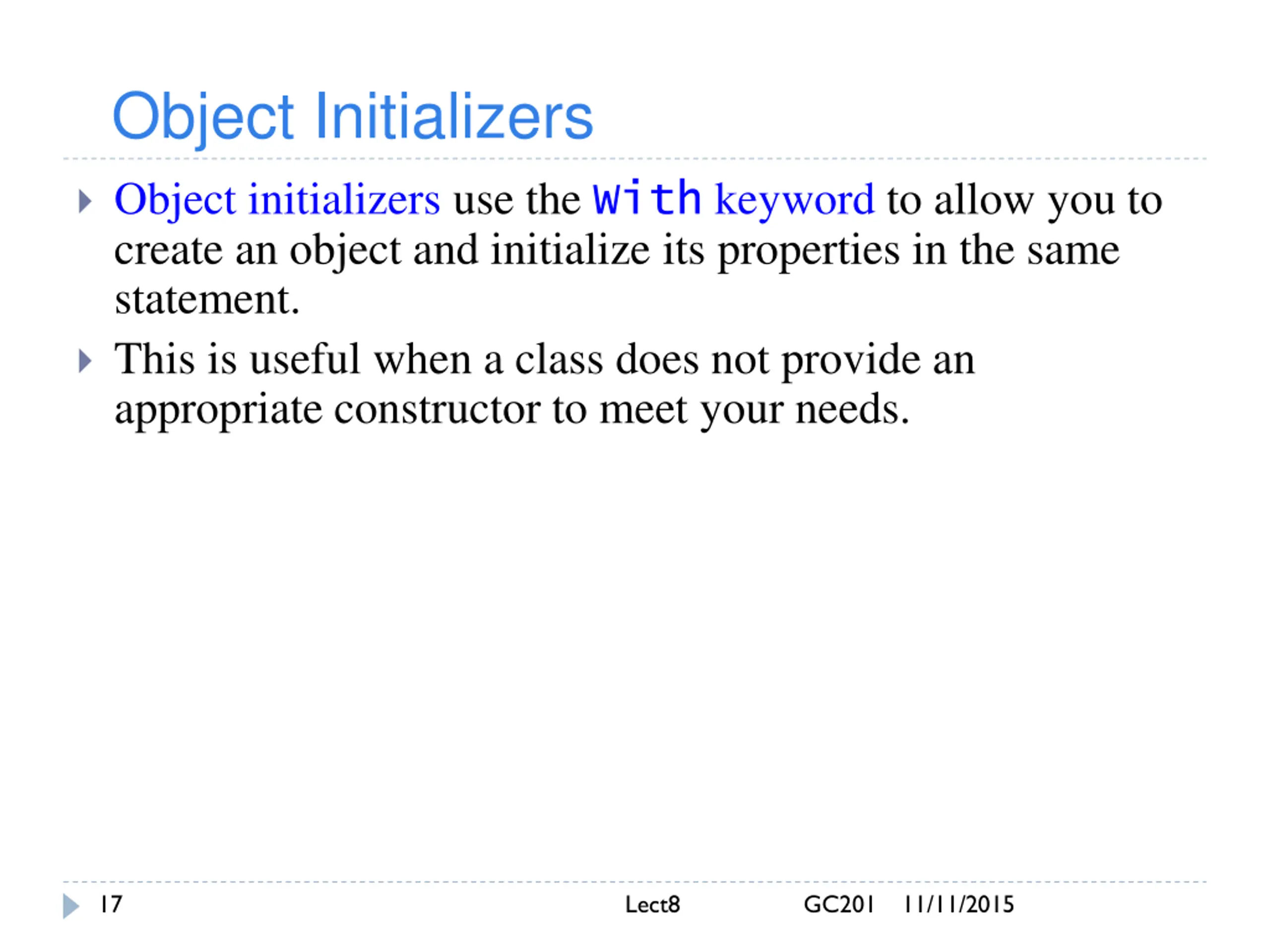 Object Initializers Object initializers use the With keyword to allow you to create an object and initialize its properties in the same statement. This is useful when a class does not provide an appropriate constructor to meet your needs. 17 Lect8 GC201 11/11/2015