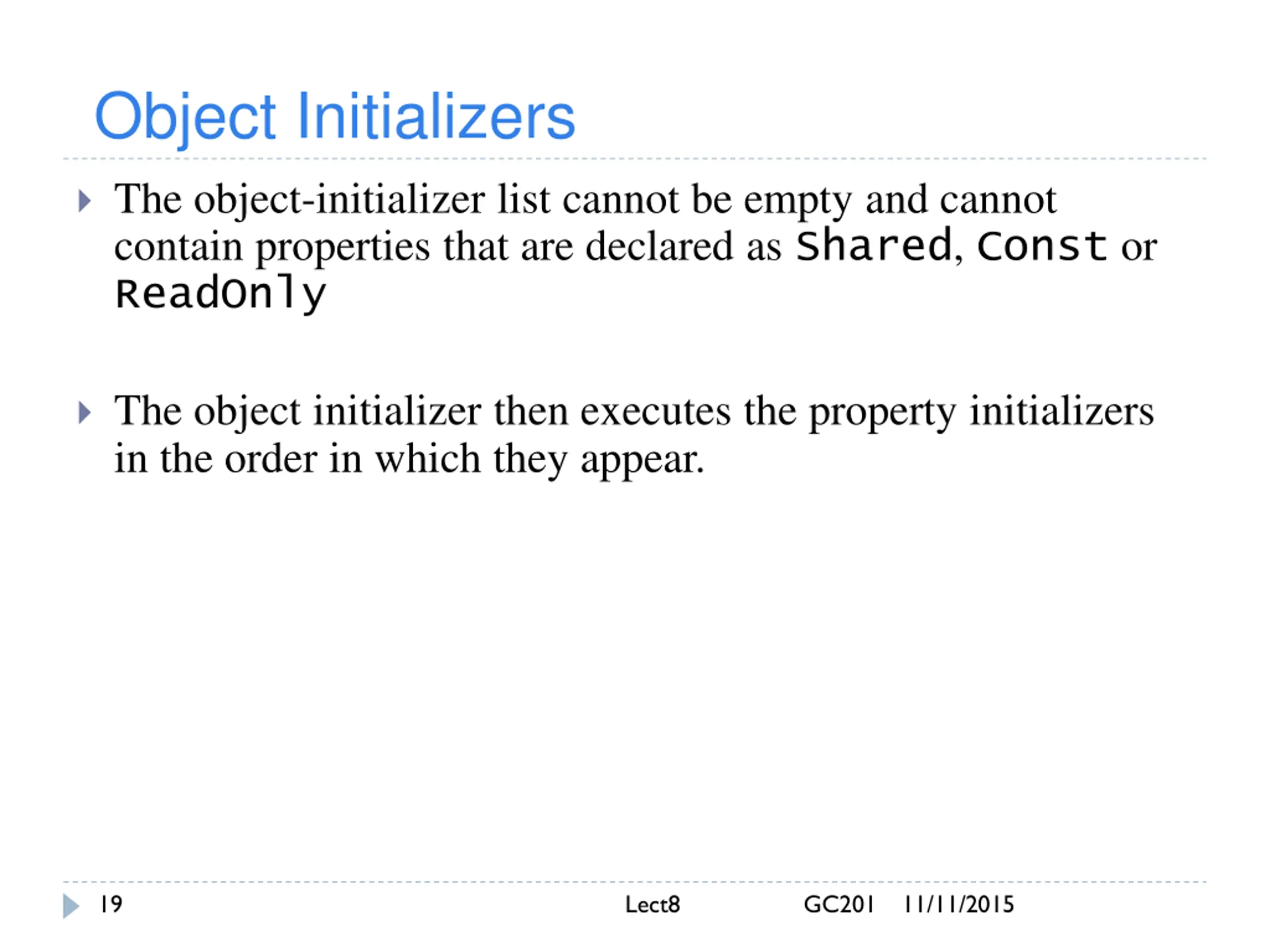 Object Initializers The object-initializer list cannot be empty and cannot contain properties that are declared as Shared, Const or ReadOnly The object initializer then executes the property initializers in the order in which they appear. 19 Lect8 GC201 11/11/2015