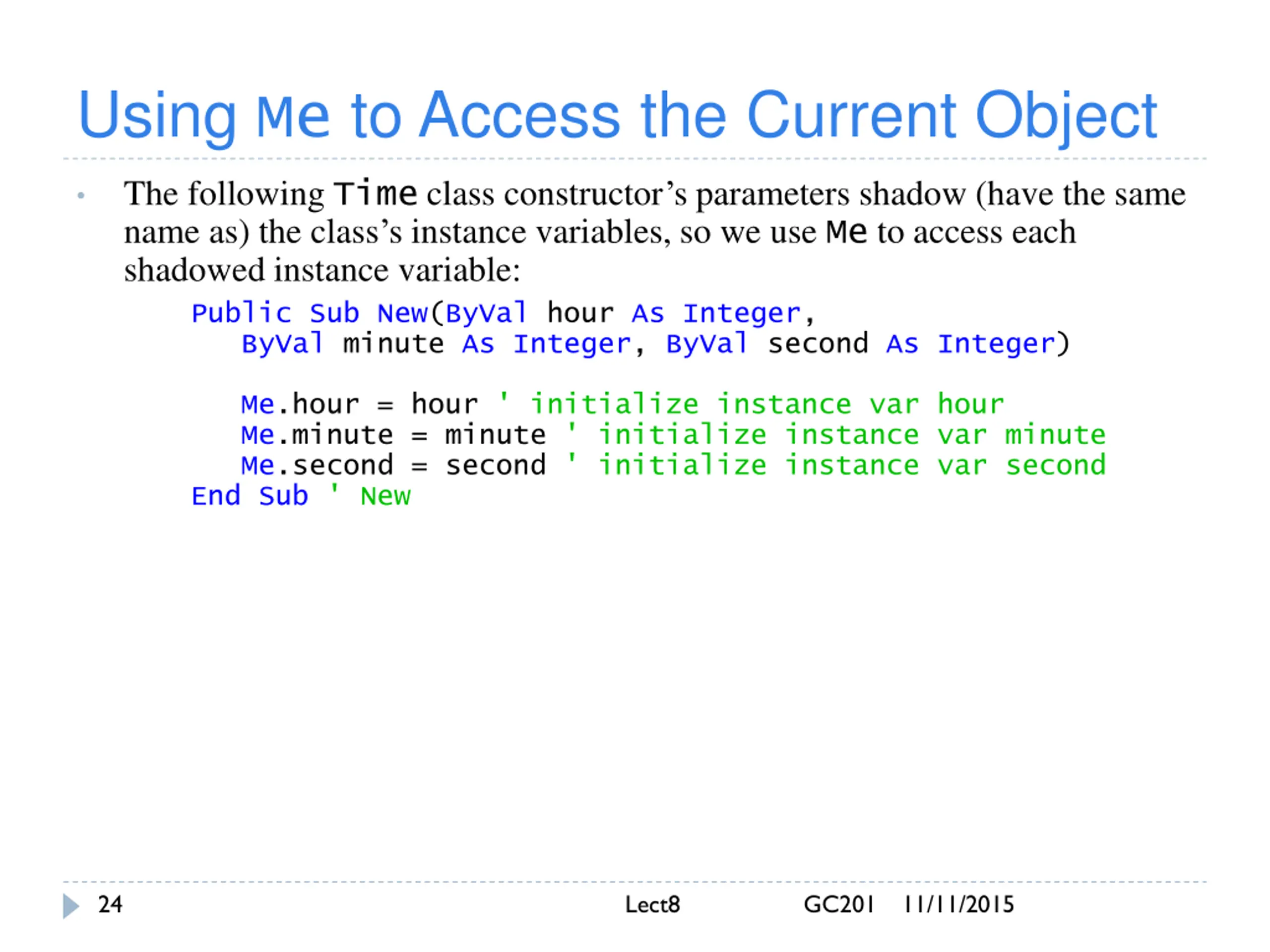 Using Me to Access the Current Object The following Time class constructor s parameters shadow (have the same name as) the class s instance variables, so we use Me to access each shadowed instance variable: Public Sub New(ByVal hour As Integer, ByVal minute As Integer, ByVal second As Integer) Me.hour = hour ' initialize instance var hour Me.minute = minute ' initialize instance var minute Me.second = second ' initialize instance var second End Sub ' New 24 Lect8 GC201 11/11/2015