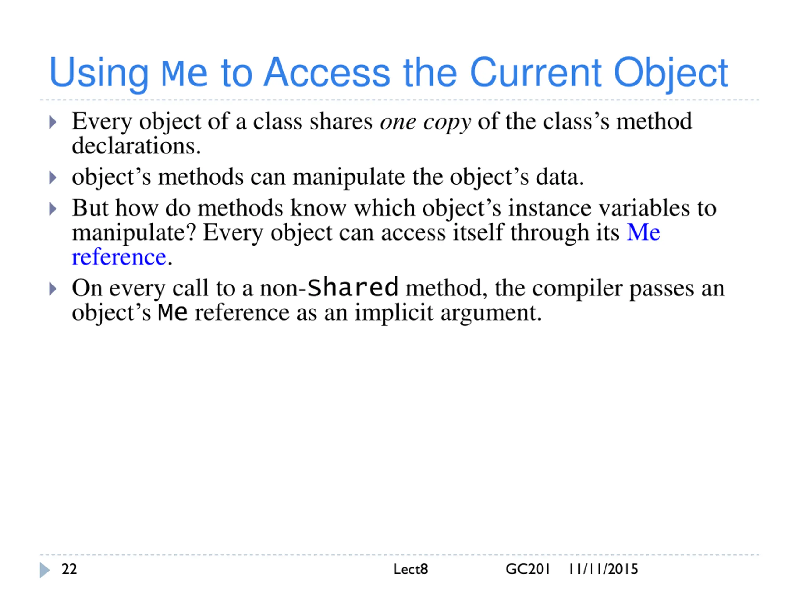 Using Me to Access the Current Object Every object of a class shares one copy of the class s method declarations. object s methods can manipulate the object s data. But how do methods know which object s instance variables to manipulate? Every object can access itself through its Me reference. On every call to a non-Shared method, the compiler passes an object s Me reference as an implicit argument. 22 Lect8 GC201 11/11/2015