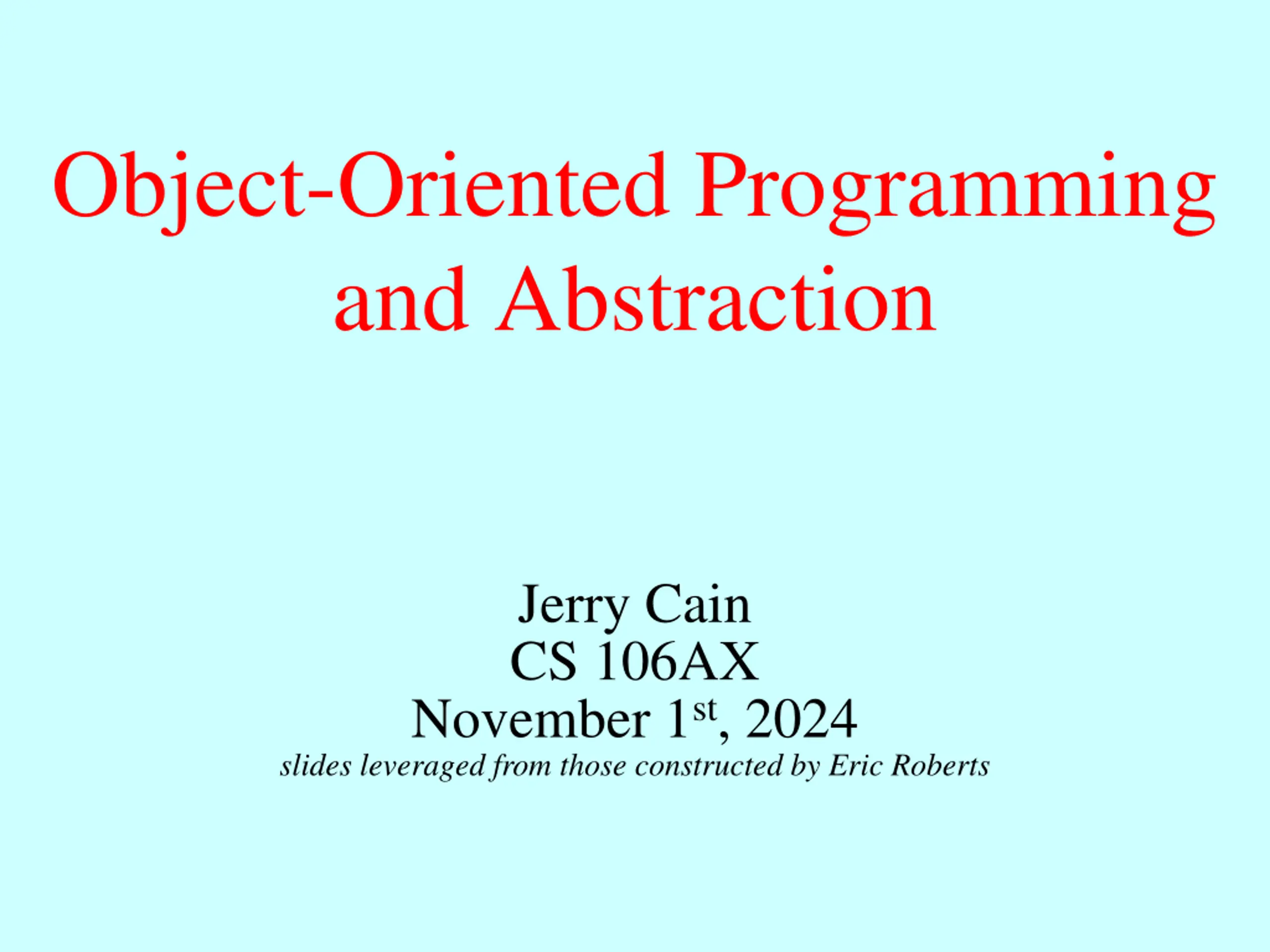 Object-Oriented Programming and Abstraction Jerry Cain CS 106AX November 1st, 2024 slides leveraged from those constructed by Eric Roberts