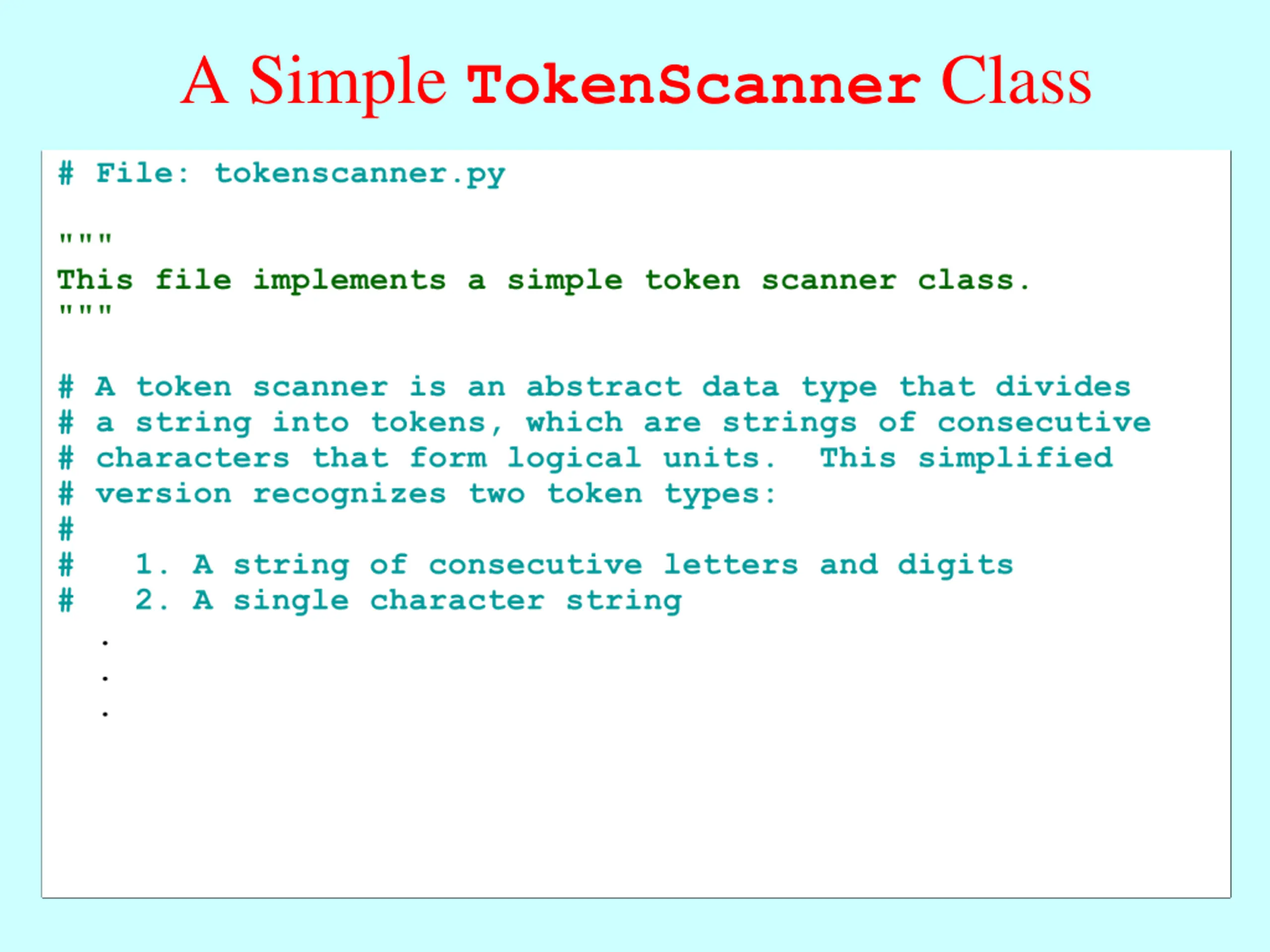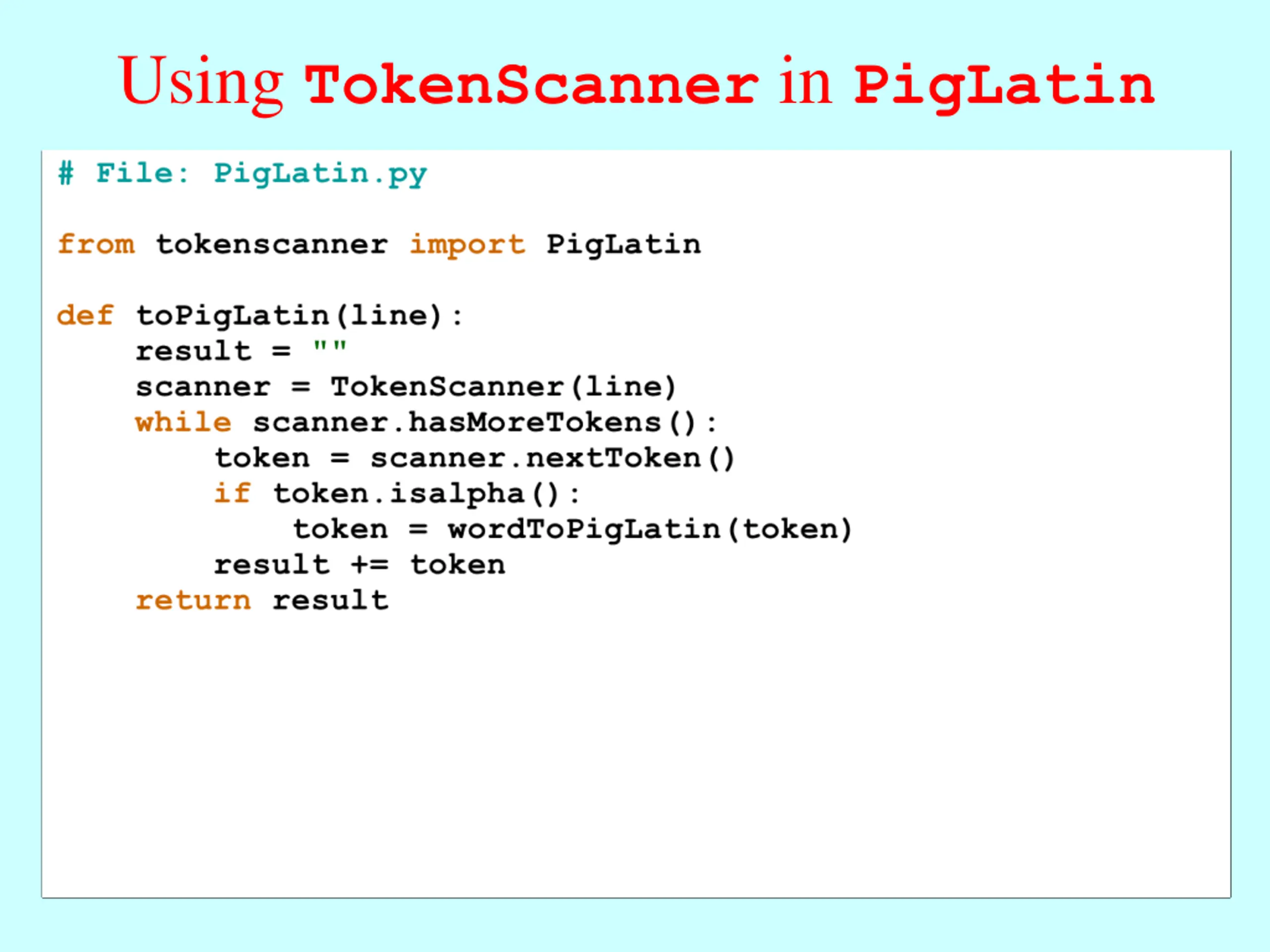 Remembering Pig Latin One of the largest examples we covered while teaching JavaScript strings was a program that translated text from English to Pig Latin. We revisited that same program when we discussed Python s support for strings. Both Pig Latin translators decomposed the problem into two functions: a toPigLatin function that divides the input into words and a wordToPigLatin function that translates a single word to its Pig Latin equivalent. The first phase of this operation is completely independent of Pig Latin domain. It would be useful to have a package that divides input strings into individual units that have integrity as a unit, as words do in English. Since the same idea applies in contexts beyond human languages, computer scientists use the term token to define these units. A library that returns individual tokens from an input source is called a token scanner.