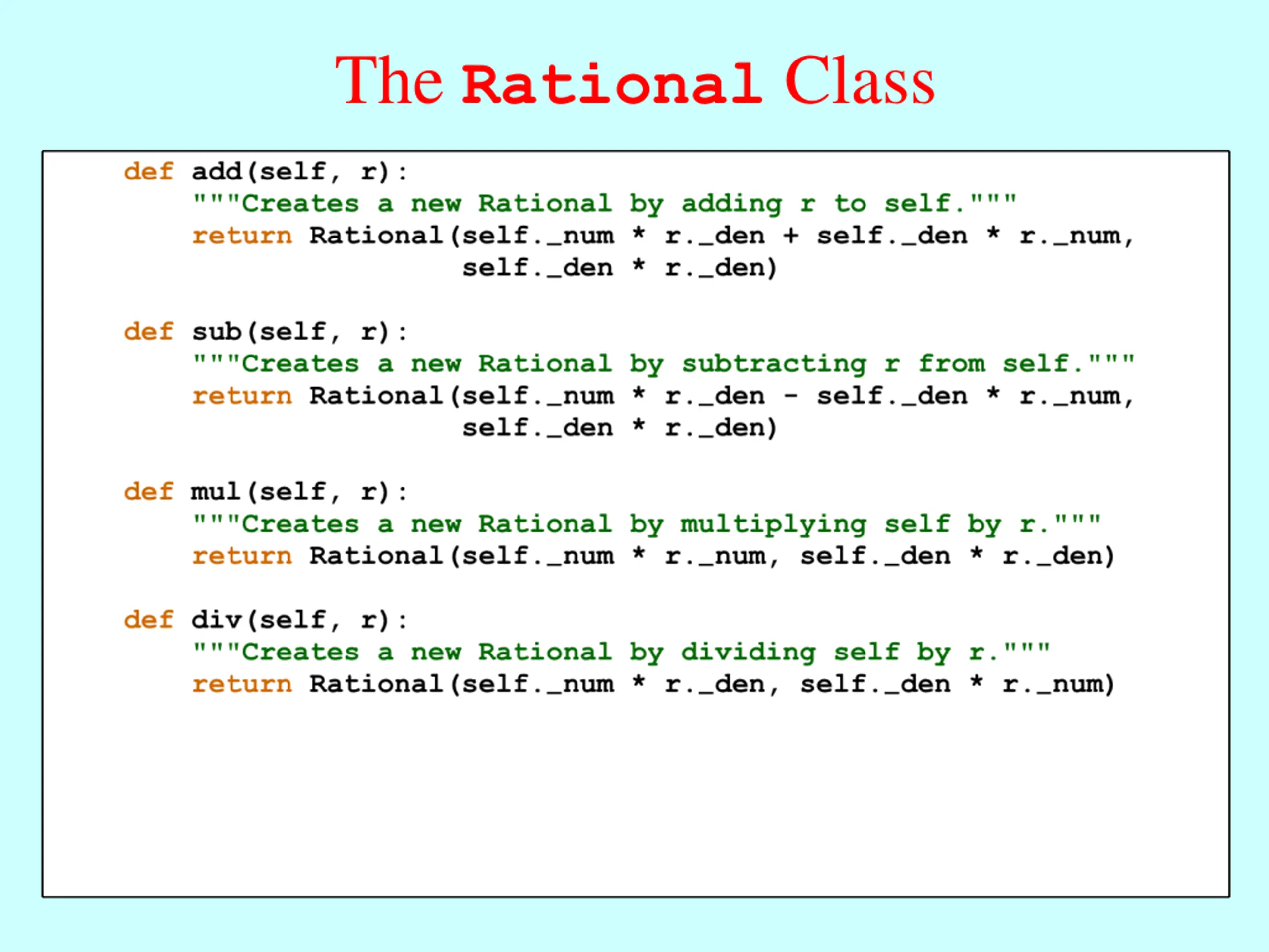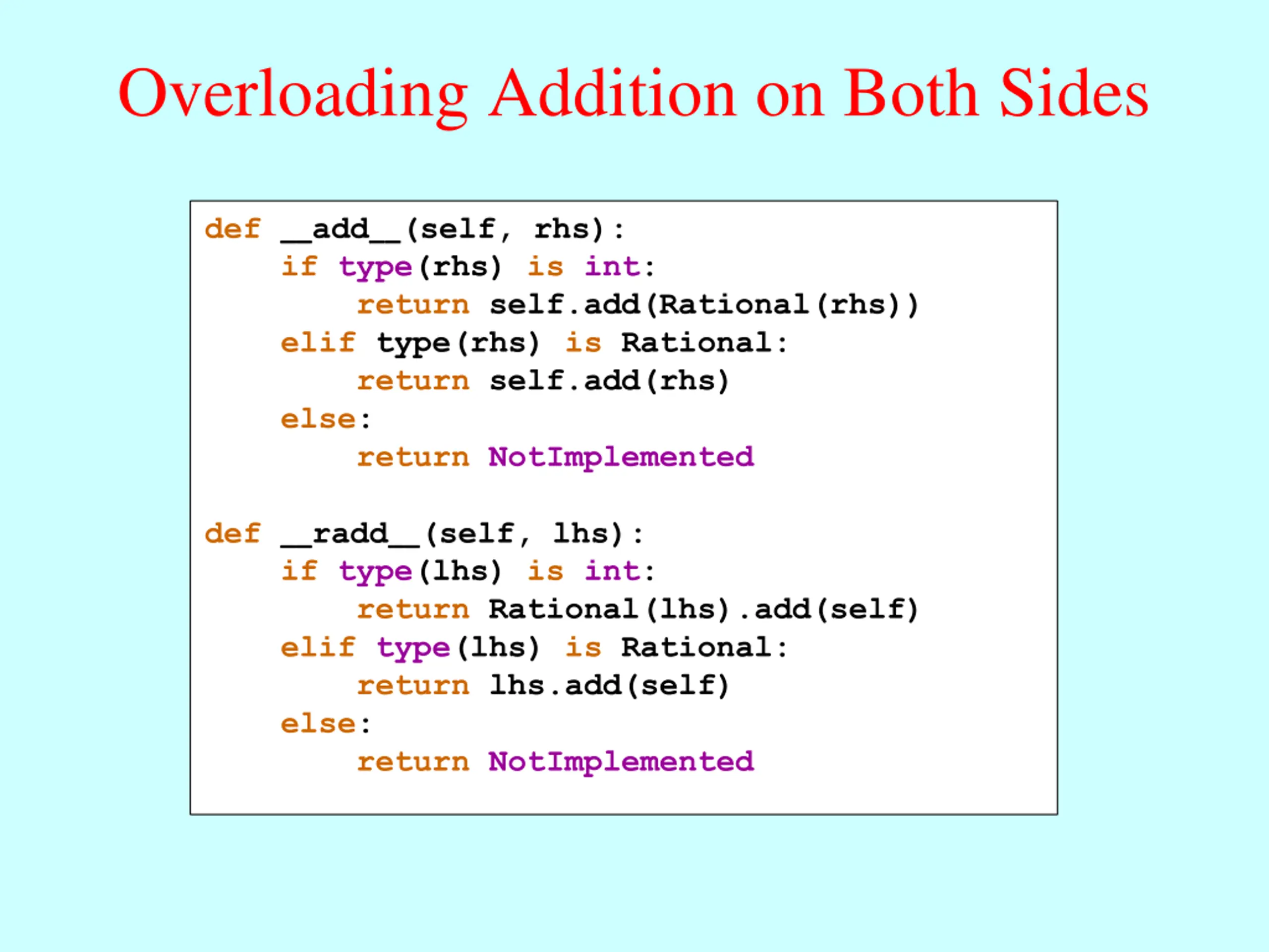 Overloading Addition on Both Sides def __add__(self, rhs): if type(rhs) is int: return self.add(Rational(rhs)) elif type(rhs) is Rational: return self.add(rhs) else: return NotImplemented def __radd__(self, lhs): if type(lhs) is int: return Rational(lhs).add(self) elif type(lhs) is Rational: return lhs.add(self) else: return NotImplemented