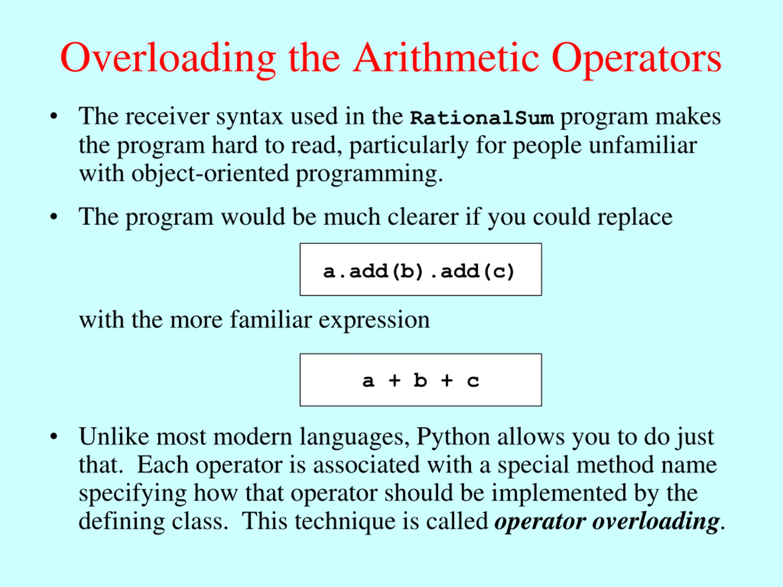 Overloading the Arithmetic Operators The receiver syntax used in the RationalSum program makes the program hard to read, particularly for people unfamiliar with object-oriented programming. The program would be much clearer if you could replace a.add(b).add(c) with the more familiar expression a + b + c Unlike most modern languages, Python allows you to do just that. Each operator is associated with a special method name specifying how that operator should be implemented by the defining class. This technique is called operator overloading.