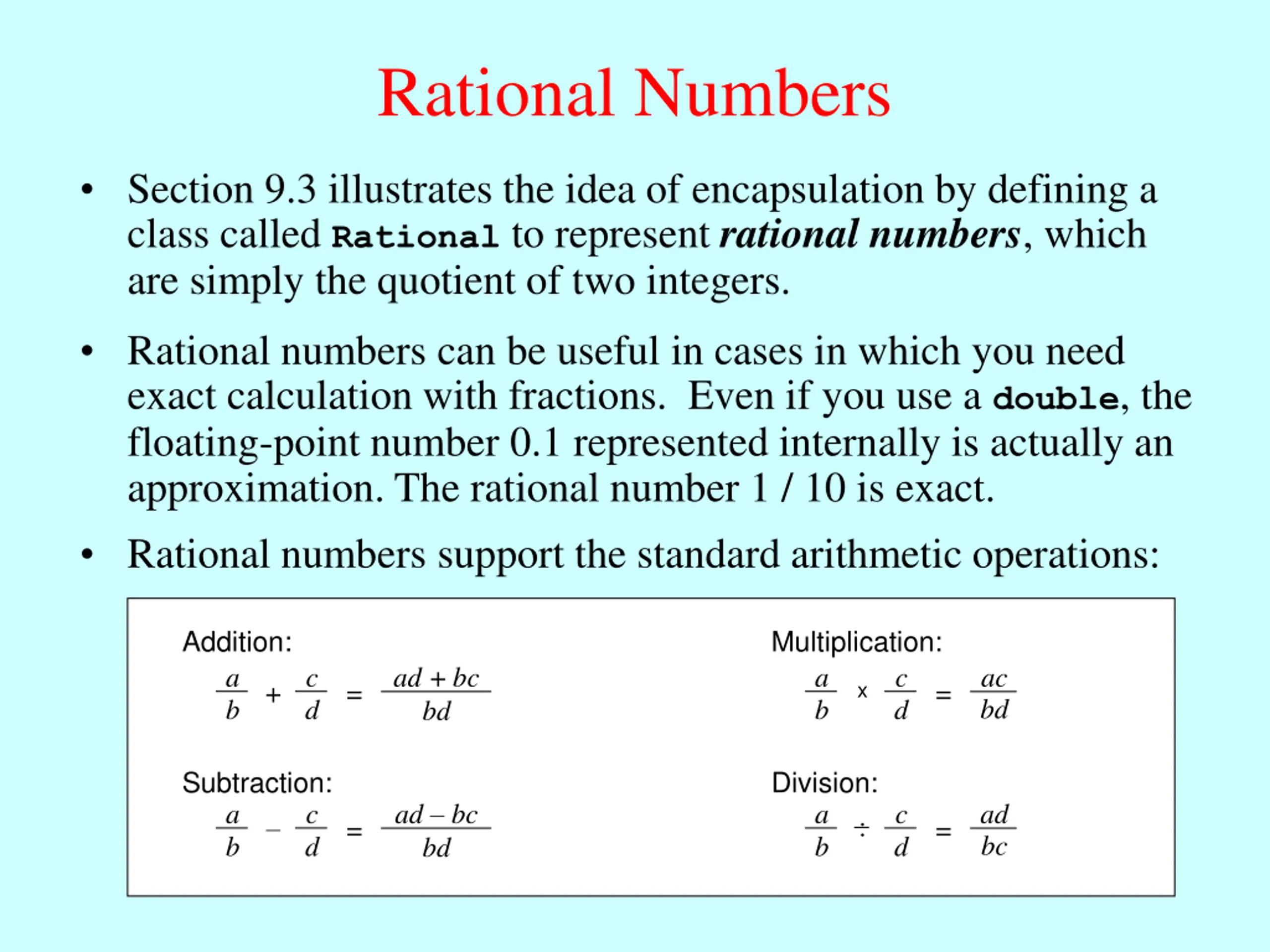 Rational Numbers Section 9.3 illustrates the idea of encapsulation by defining a class called Rational to represent rational numbers, which are simply the quotient of two integers. Rational numbers can be useful in cases in which you need exact calculation with fractions. Even if you use a double, the floating-point number 0.1 represented internally is actually an approximation. The rational number 1 / 10 is exact. Rational numbers support the standard arithmetic operations: Addition: Multiplication: a b c d ad +bc bd a b c d ac bd + = = x Subtraction: Division: a b c d ad bc bd a b c d ad bc .. = =