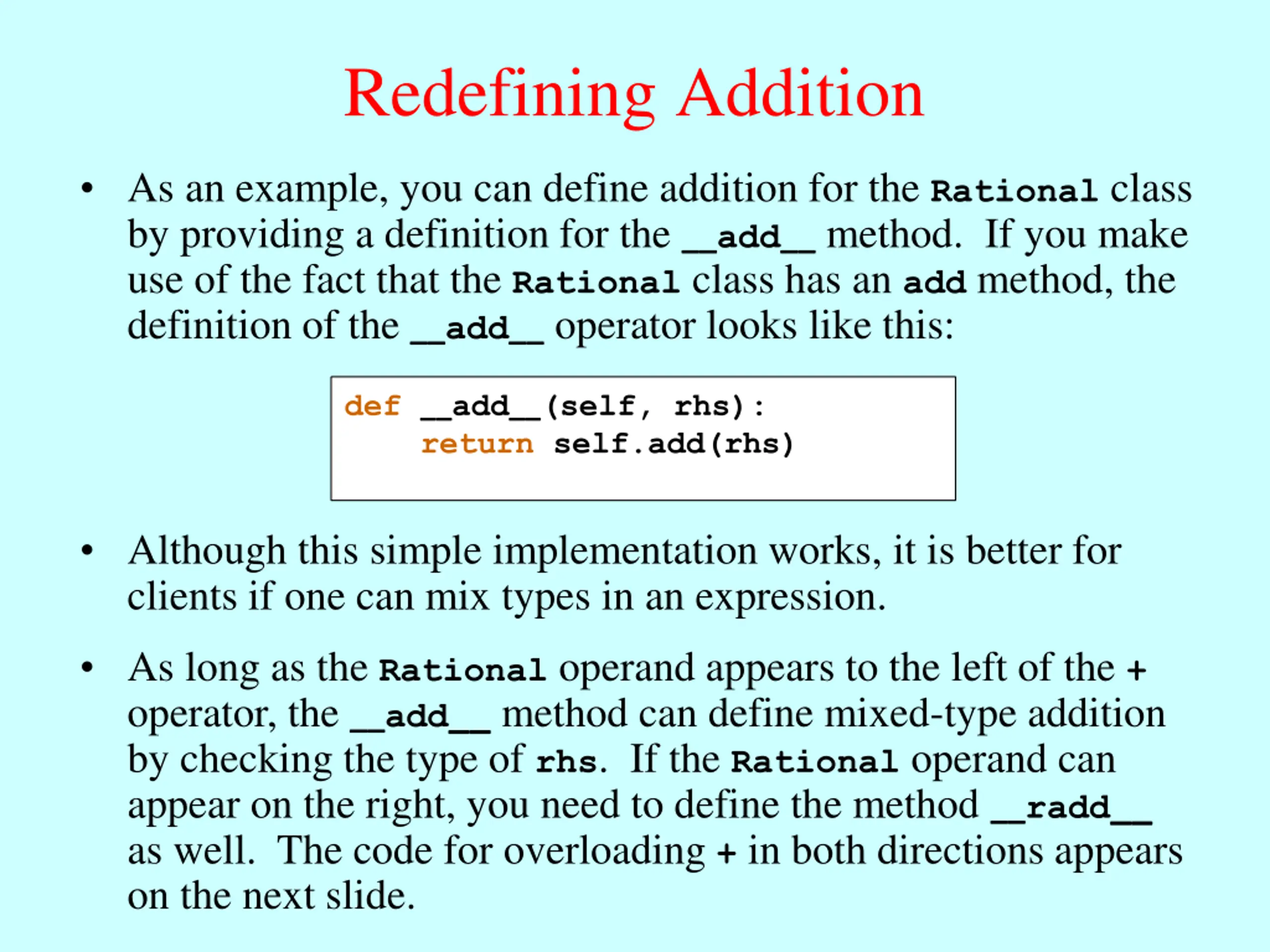 Redefining Addition As an example, you can define addition for the Rational class by providing a definition for the __add__ method. If you make use of the fact that the Rational class has an add method, the definition of the __add__ operator looks like this: def __add__(self, rhs): return self.add(rhs) Although this simple implementation works, it is better for clients if one can mix types in an expression. As long as the Rational operand appears to the left of the + operator, the __add__ method can define mixed-type addition by checking the type of rhs. If the Rational operand can appear on the right, you need to define the method __radd__ as well. The code for overloading + in both directions appears on the next slide.