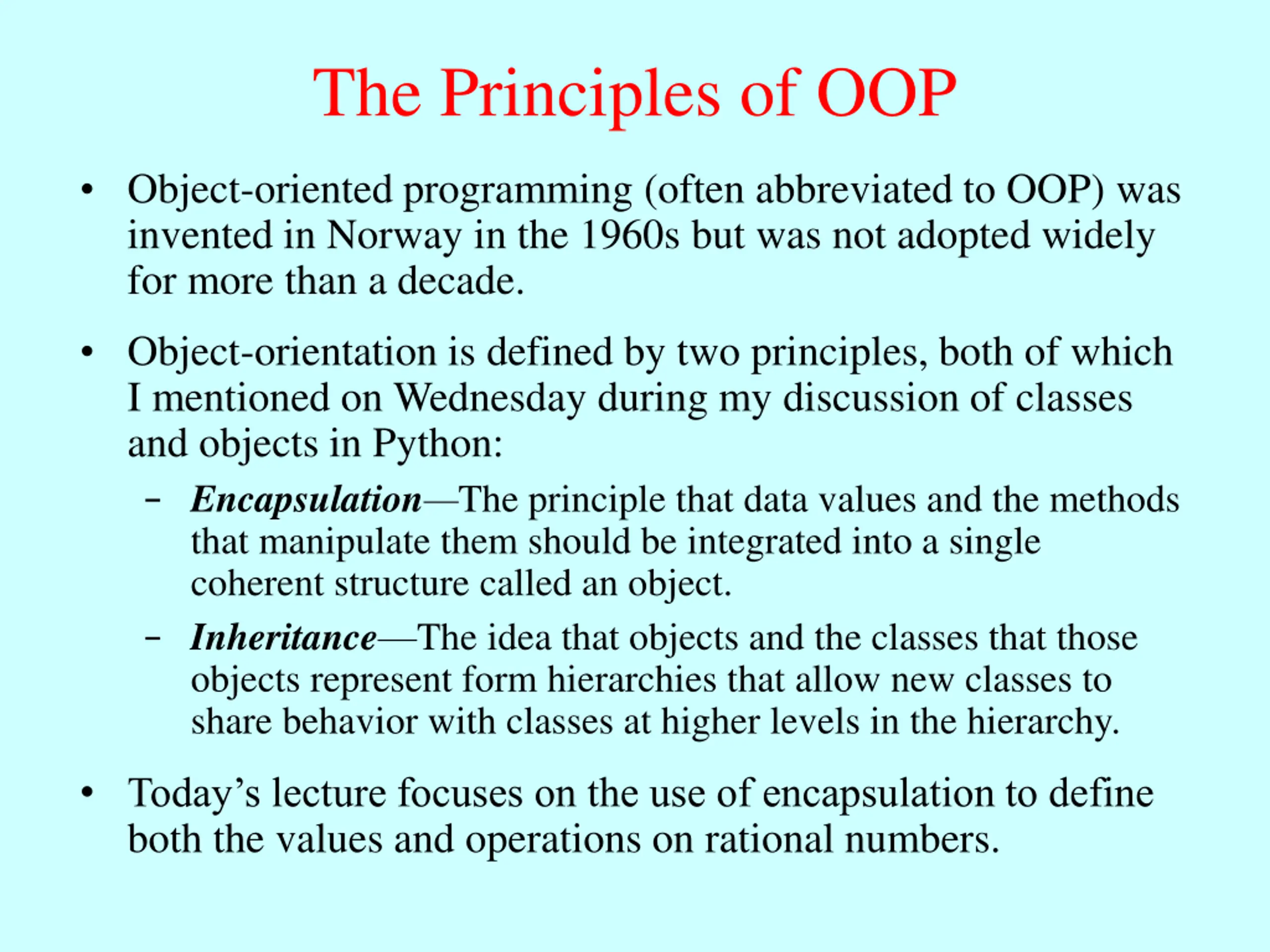 The Principles of OOP Object-oriented programming (often abbreviated to OOP) was invented in Norway in the 1960s but was not adopted widely for more than a decade. Object-orientation is defined by two principles, both of which I mentioned on Wednesday during my discussion of classes and objects in Python: Encapsulation The principle that data values and the methods that manipulate them should be integrated into a single coherent structure called an object. Inheritance The idea that objects and the classes that those objects represent form hierarchies that allow new classes to share behavior with classes at higher levels in the hierarchy. Today s lecture focuses on the use of encapsulation to define both the values and operations on rational numbers.