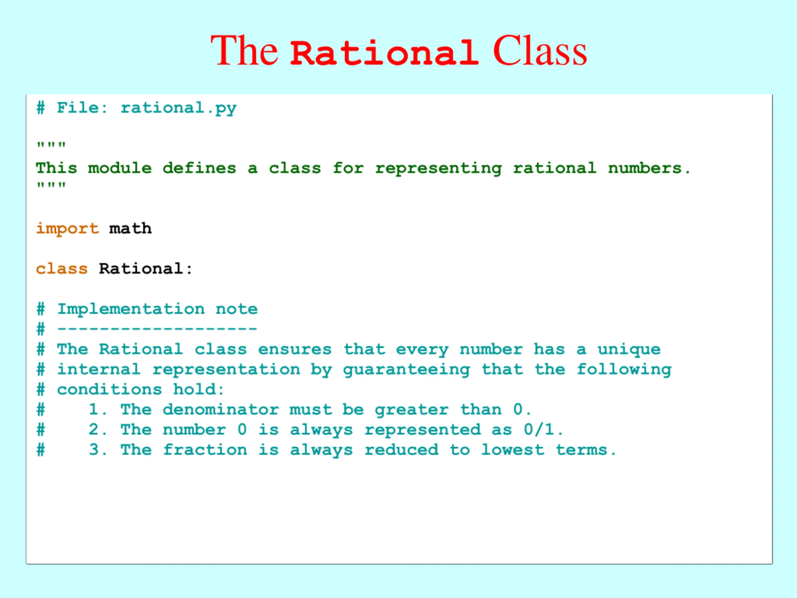 Implementing the Rational Class The next three slides show the initial version of the Rational class along with some brief annotations. As you read through the code, the following features are worth special attention: The constructor checks that rational numbers obey certain rules. These rules are described in more detail in the text but include reducing the fraction to lowest terms. For now, operations are specified using the receiver syntax. When you apply an operator to two Rational values, one of the operands is the receiver and the other is passed as an argument, as in r1.add(r2)