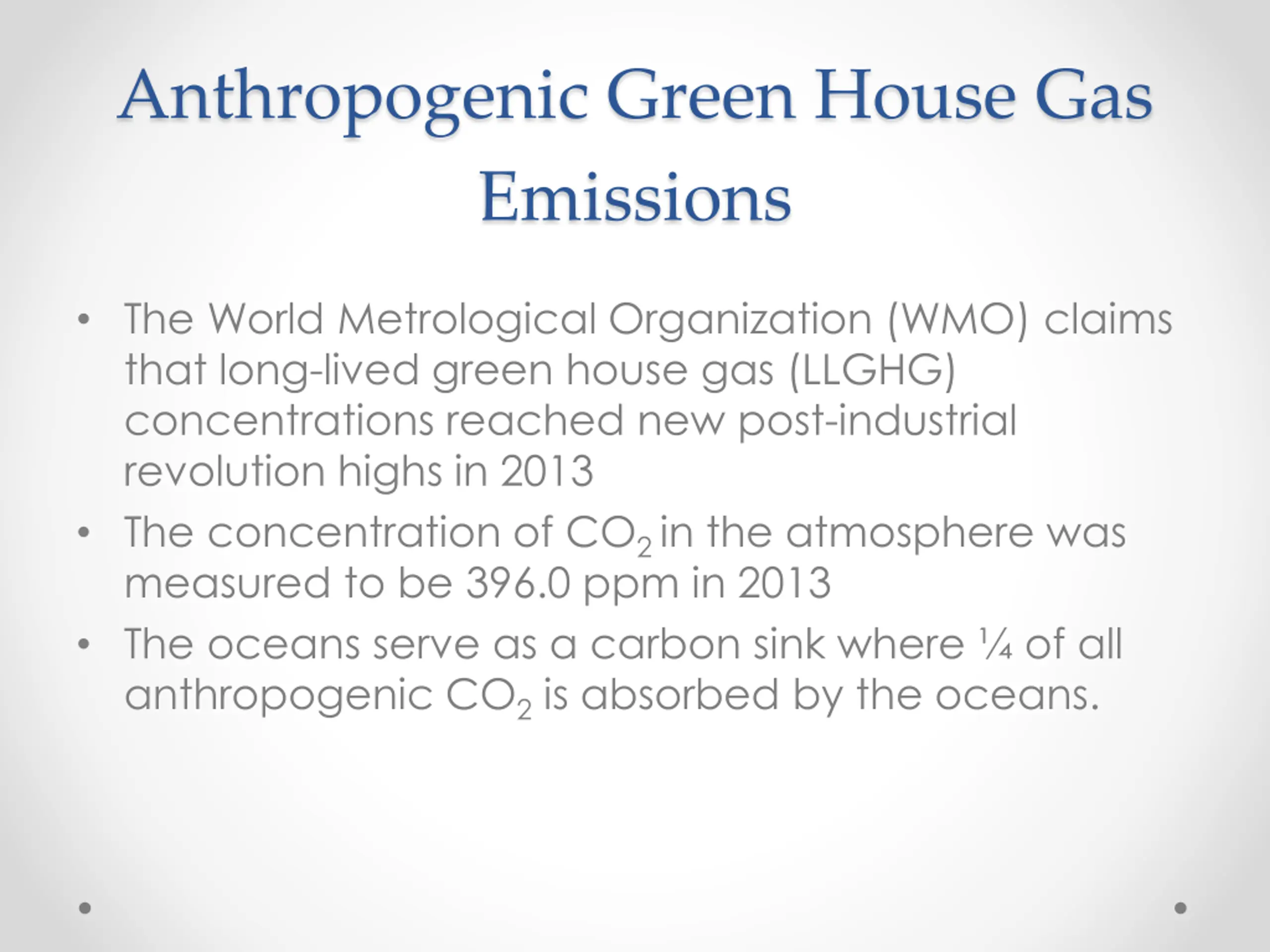 Anthropogenic Green House Gas Emissions The World Metrological Organization (WMO) claims that long-lived green house gas (LLGHG) concentrations reached new post-industrial revolution highs in 2013 The concentration of CO2 in the atmosphere was measured to be 396.0 ppm in 2013 The oceans serve as a carbon sink where of all anthropogenic CO2is absorbed by the oceans.