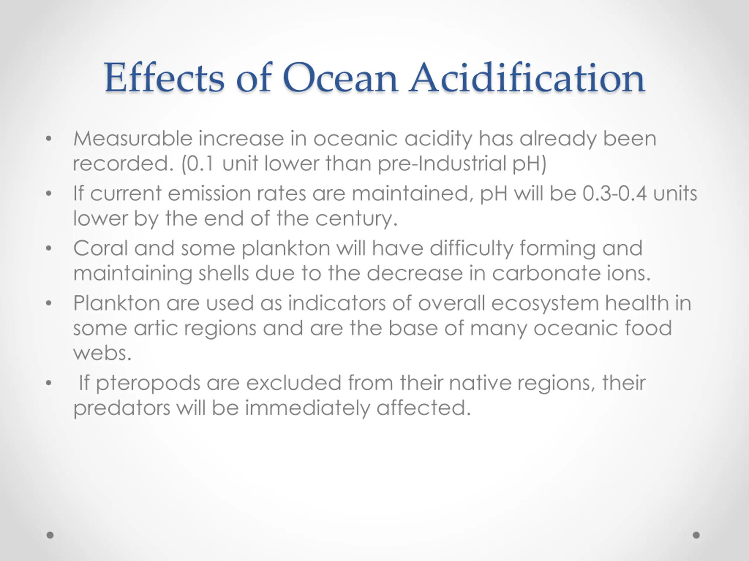 Effects of Ocean Acidification Measurable increase in oceanic acidity has already been recorded. (0.1 unit lower than pre-Industrial pH) If current emission rates are maintained, pH will be 0.3-0.4 units lower by the end of the century. Coral and some plankton will have difficulty forming and maintaining shells due to the decrease in carbonate ions. Plankton are used as indicators of overall ecosystem health in some artic regions and are the base of many oceanic food webs. If pteropods are excluded from their native regions, their predators will be immediately affected.