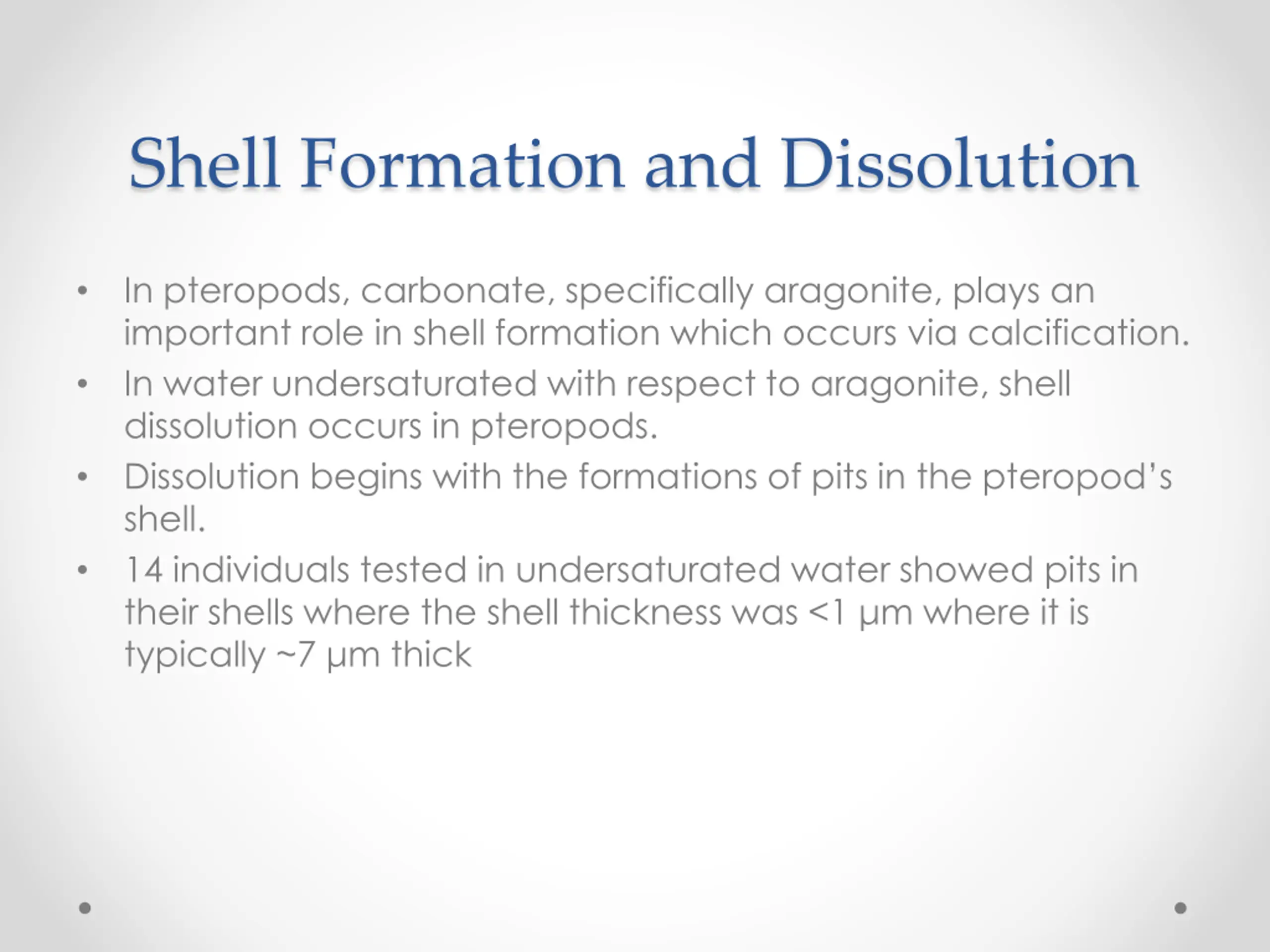 Shell Formation and Dissolution In pteropods, carbonate, specifically aragonite, plays an important role in shell formation which occurs via calcification. In water undersaturated with respect to aragonite, shell dissolution occurs in pteropods. Dissolution begins with the formations of pits in the pteropod s shell. 14 individuals tested in undersaturated water showed pits in their shells where the shell thickness was <1 m where it is typically ~7 m thick
