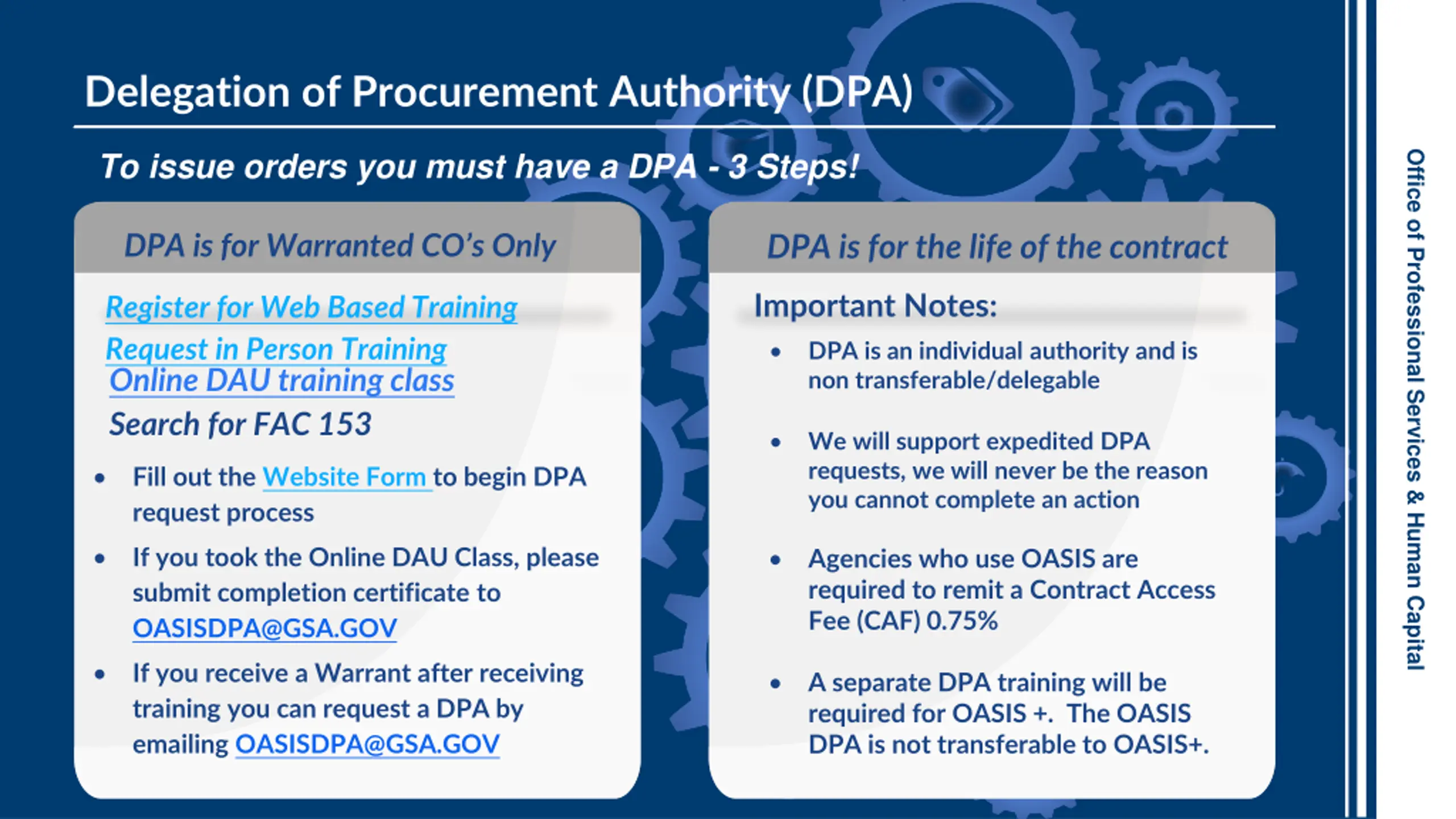 Delegation of Procurement Authority (DPA) To issue orders you must have a DPA - 3 Steps! Office of Professional Services & Human Capital DPA is for Warranted CO s Only DPA is for the life of the contract Important Notes: DPA is an individual authority and is non transferable/delegable Register for Web Based Training Request in Person Training Online DAU training class Search for FAC 153 We will support expedited DPA requests, we will never be the reason you cannot complete an action Fill out the Website Form to begin DPA request process If you took the Online DAU Class, please submit completion certificate to OASISDPA@GSA.GOV Agencies who use OASIS are required to remit a Contract Access Fee (CAF) 0.75% If you receive a Warrant after receiving training you can request a DPA by emailing OASISDPA@GSA.GOV A separate DPA training will be required for OASIS +. The OASIS DPA is not transferable to OASIS+.
