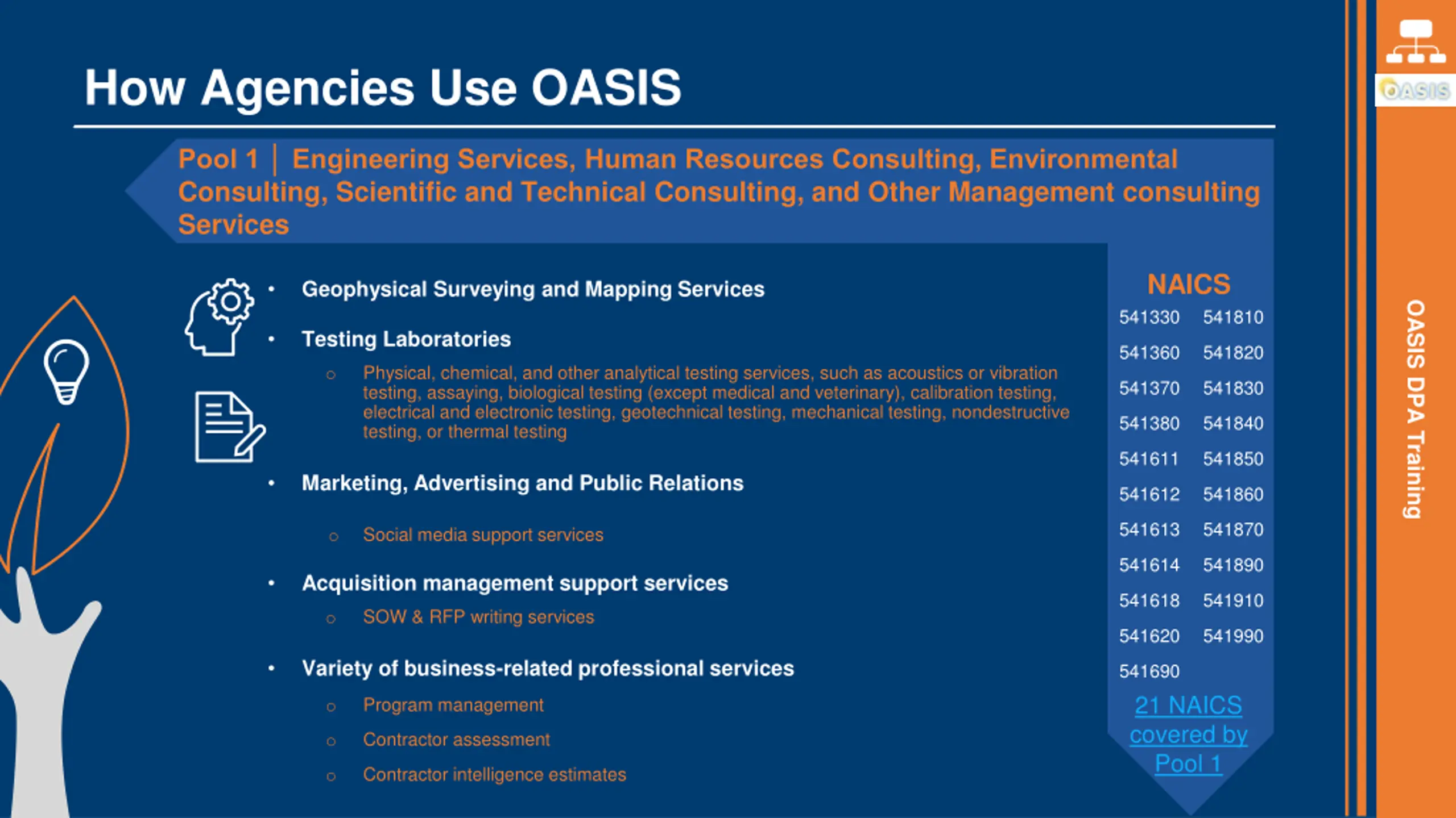 How Agencies Use OASIS Pool 1 Engineering Services, Human Resources Consulting, Environmental Consulting, Scientific and Technical Consulting, and Other Management consulting Services NAICS 541330 Geophysical Surveying and Mapping Services OASIS DPA Training 541810 Testing Laboratories 541360 541820 Physical, chemical, and other analytical testing services, such as acoustics or vibration testing, assaying, biological testing (except medical and veterinary), calibration testing, electrical and electronic testing, geotechnical testing, mechanical testing, nondestructive testing, or thermal testing o 541370 541830 541380 541840 541611 541850 Marketing, Advertising and Public Relations 541612 541860 541613 541870 Social media support services o 541614 541890 Acquisition management support services 541618 541910 SOW & RFP writing services o 541620 541990 Variety of business-related professional services 541690 21 NAICS covered by Pool 1 Program management o Contractor assessment o Contractor intelligence estimates o