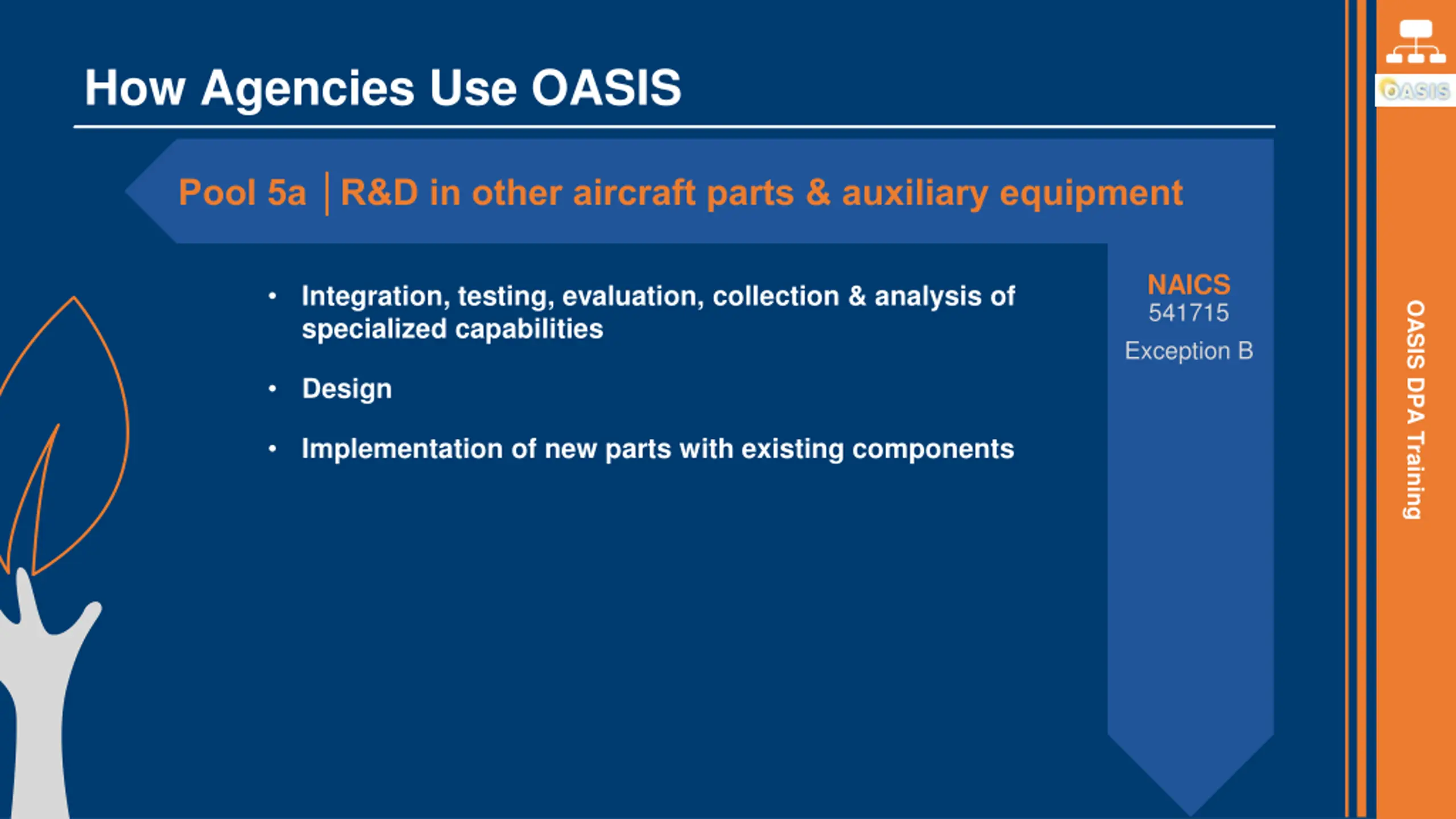 How Agencies Use OASIS Pool 5a R&D in other aircraft parts & auxiliary equipment NAICS 541715 Exception B Integration, testing, evaluation, collection & analysis of specialized capabilities OASIS DPA Training Design Implementation of new parts with existing components