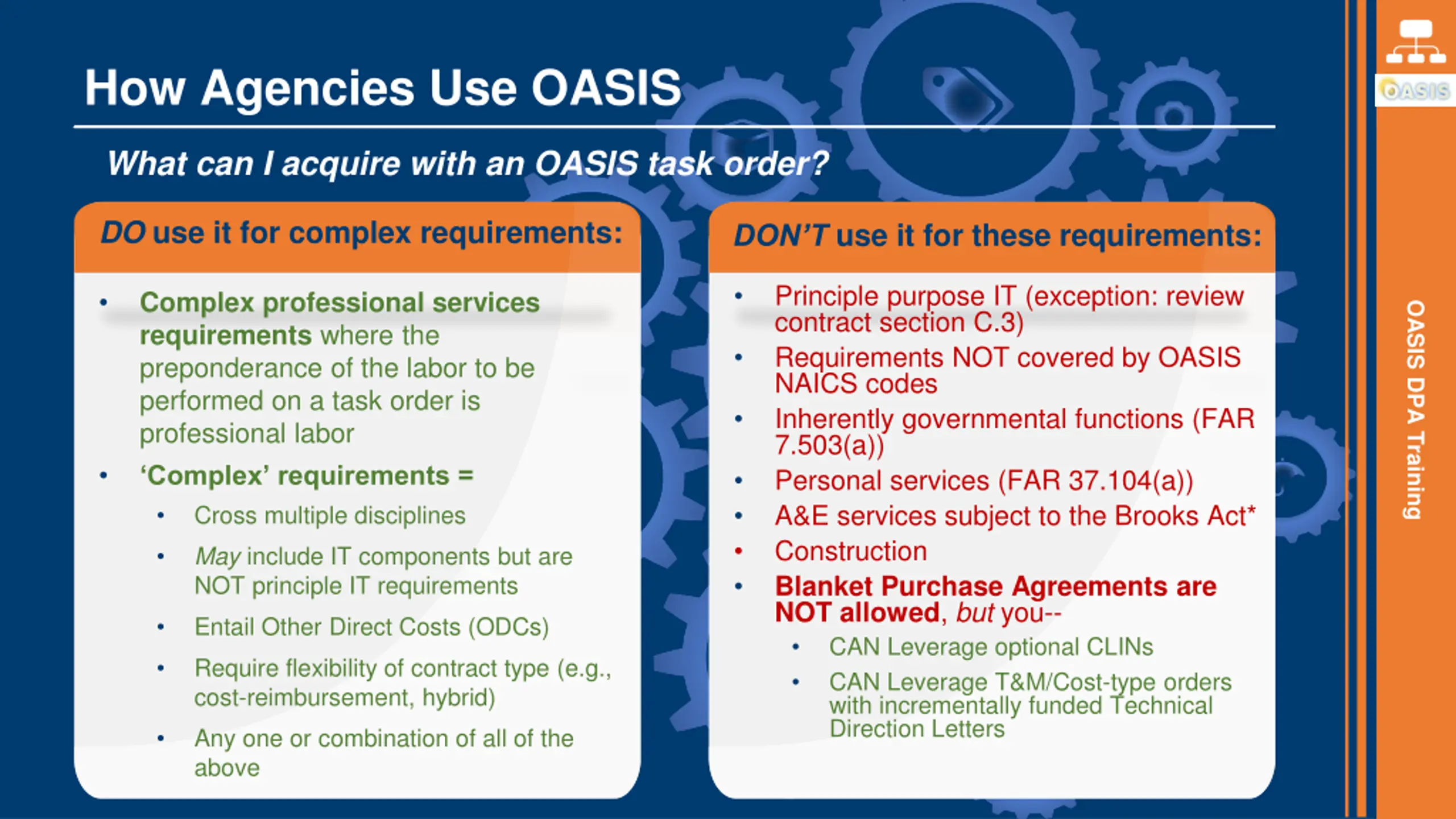 How Agencies Use OASIS What can I acquire with an OASIS task order? DO use it for complex requirements: DON T use it for these requirements: Principle purpose IT (exception: review contract section C.3) Requirements NOT covered by OASIS NAICS codes Inherently governmental functions (FAR 7.503(a)) Personal services (FAR 37.104(a)) A&E services subject to the Brooks Act* Construction Blanket Purchase Agreements are NOT allowed, but you-- CAN Leverage optional CLINs CAN Leverage T&M/Cost-type orders with incrementally funded Technical Direction Letters Complex professional services requirements where the preponderance of the labor to be performed on a task order is professional labor Complex requirements = Cross multiple disciplines OASIS DPA Training May include IT components but are NOT principle IT requirements Entail Other Direct Costs (ODCs) Require flexibility of contract type (e.g., cost-reimbursement, hybrid) Any one or combination of all of the above